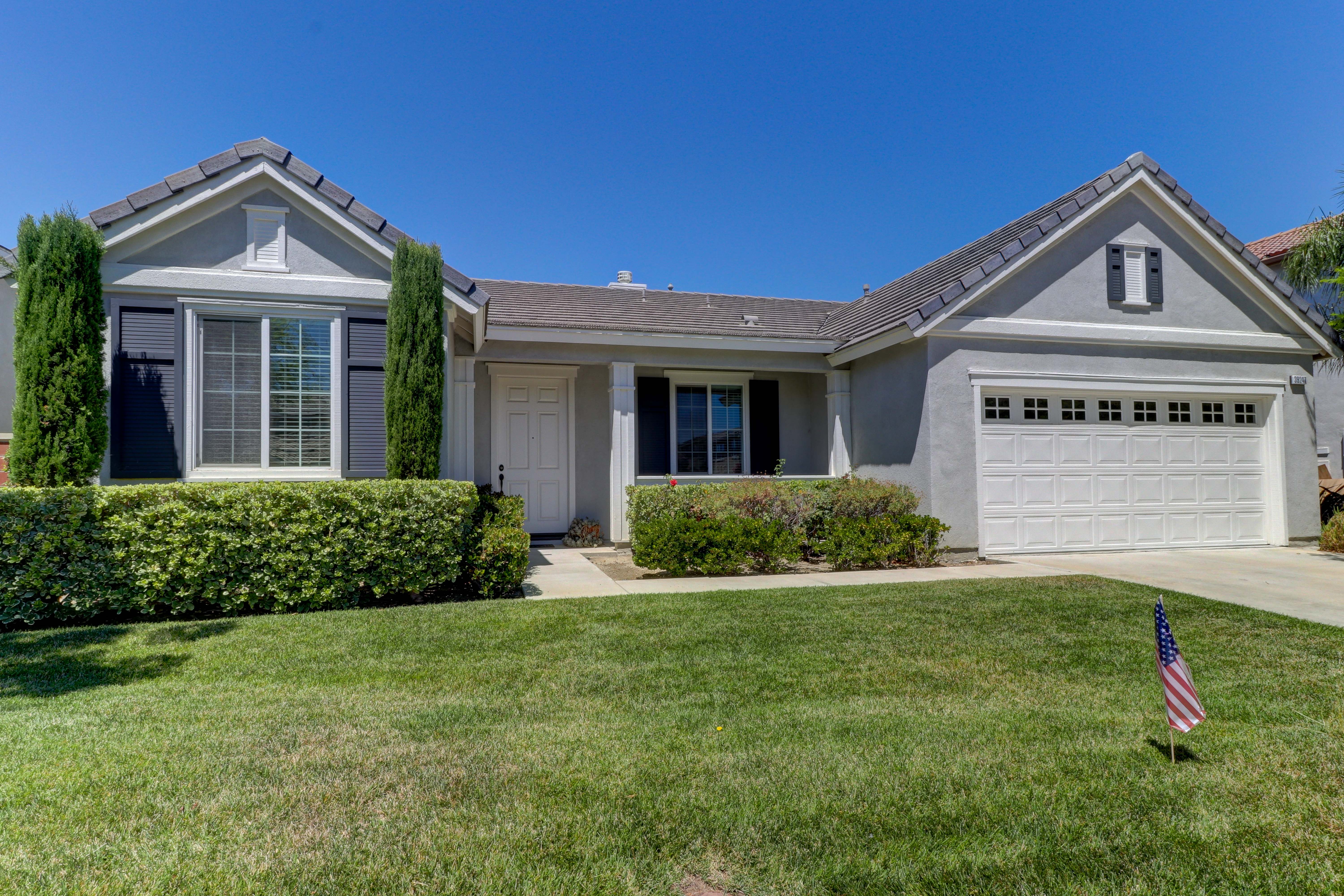 Highly sought after single story home in Central Park. Fresh paint and new carpet inside, too! This open style floor plan lets in plenty of light and has plenty of space. The kitchen features a center island with bay window/eat-in kitchen area that smoothly flows into the great room that includes surround sound speakers along with a welcoming fireplace to enjoy our chilly Murrieta winter evenings. Master suite features 2 walk-in closets, shower and separate soaker tub along with dual vanity sinks.