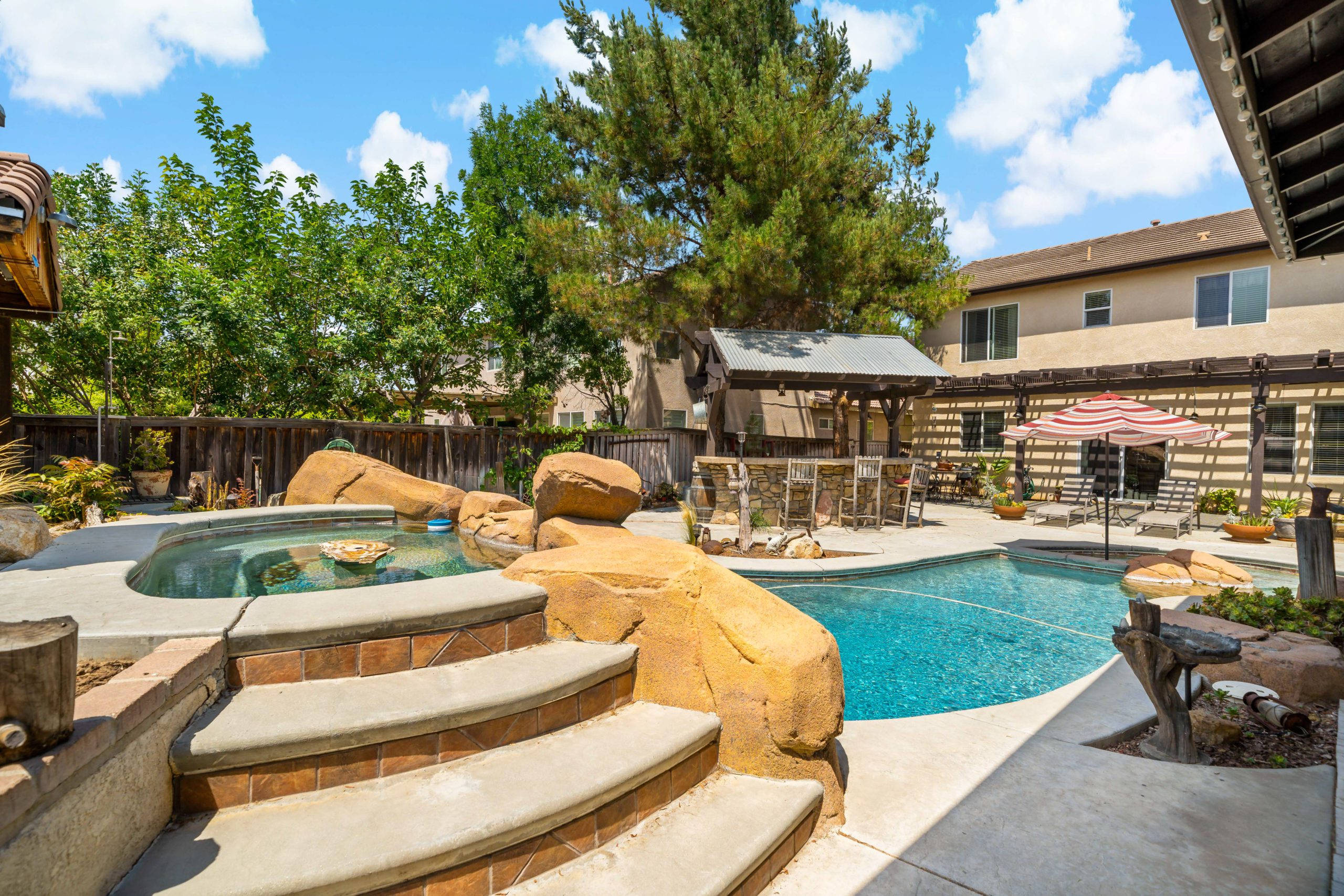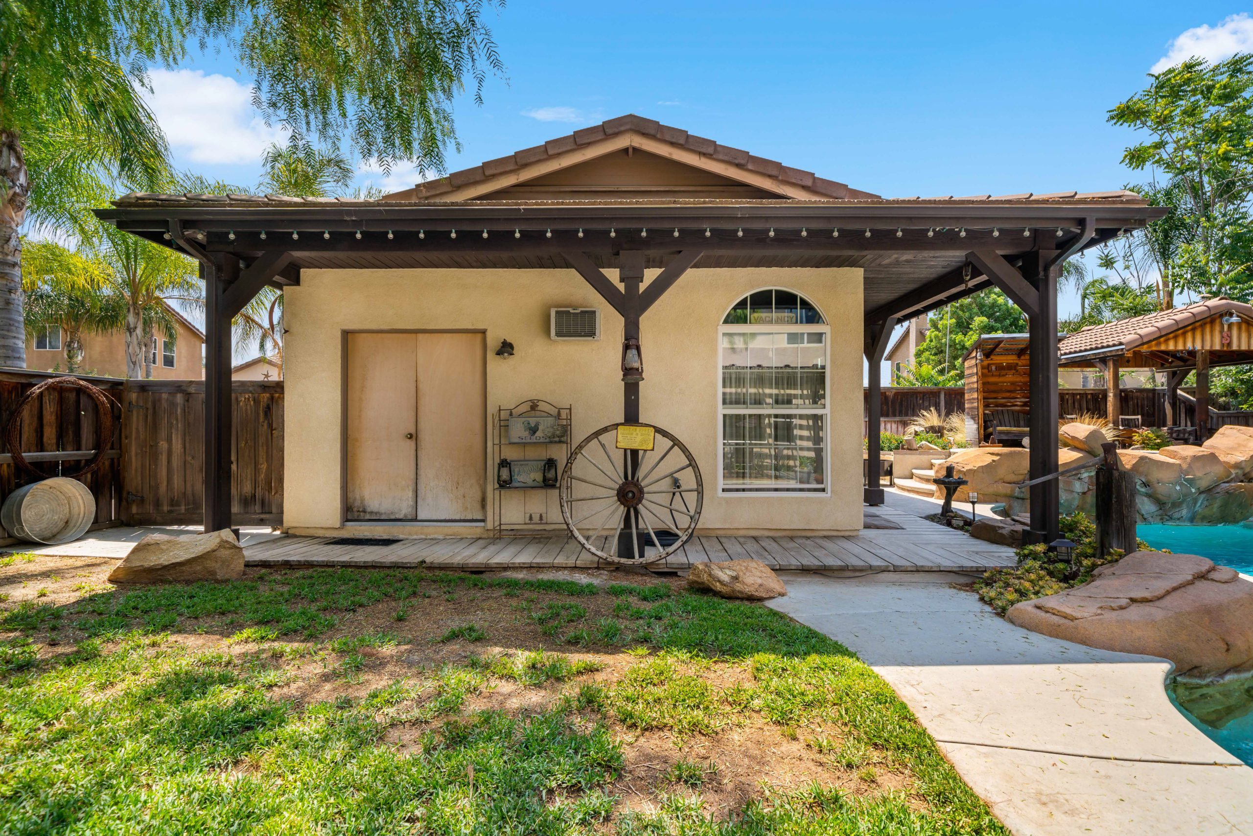 This is the over-the-top backyard pool paradise you’ve been waiting for! Exquisitely unique entertainer’s delight from the boulder-style pool and spa to the custom gazebos and outdoor kitchen. There is even a casita with full bath along with onsite RV storage complete with hook-up. This home, situated in the popular Mapleton community, is located on a peaceful cul-de-sac. Plenty of upgrades including the oversized kitchen tile flooring, granite counters, cabinets with pulls, farmhouse sink, butler’s pantry, stainless steel appliances and center island. Enjoy the downstairs tasteful dark flooring, wide baseboards and ceiling fans throughout. Freshly installed carpet upstairs. The gorgeous stacked stone family room wall with built-ins and custom mantel fireplace will truly wow…ideal for enjoying our chilly Murrieta winter evenings. The master suite comes complete with crown molding, deep walk-in closet, dual vanity sinks, separate shower and soaking tub. There is even an upstairs loft that is perfect for media, computer stations or just relaxing at the end of the day. 3-car tandem garage with epoxy coated flooring, attic fan, newer water heater and exterior gutters. No HOA fees. Close proximity to the school and I-215. Call today to schedule your tour!