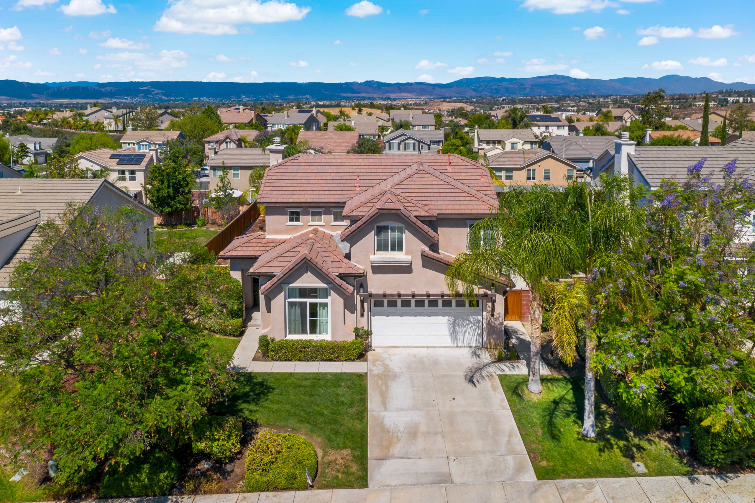 Step into the open concept charm this Pulte-built Central Park home has to offer. Sizeable backyard with a neighborhood VIEW which can easily accommodate a pool. Spectacular mountain view from the master suite! This popular floor plan features a sunken living room and also a step down family room which includes an inviting fireplace-ideal for enjoying our chilly Murrieta winter evenings. The spacious eat-in kitchen is complete with pantry, center island, granite tile counters and maple cabinets. Enjoy the master suite with French door entry, jetted corner tub, separate shower and walk-in closet. Upstairs laundry room. The alumawood patio cover in back along with the fruit trees and custom brick paver raised area creates that perfect space to relax at the end of the day. Imagine enjoying this spacious area in which you can your put in your own spa, pool, barbeque or sizeable playground since this is one of the larger backyards in this section of Central Park. Central Park is a highly desirable neighborhood offering hiking trails, pool, clubhouse, tennis court, basketball court, volleyball, tot lot and picnic areas. Low HOA/low taxes and Temecula schools. Close and convenient to shopping, dining, interstates and local wineries. Call to tour!