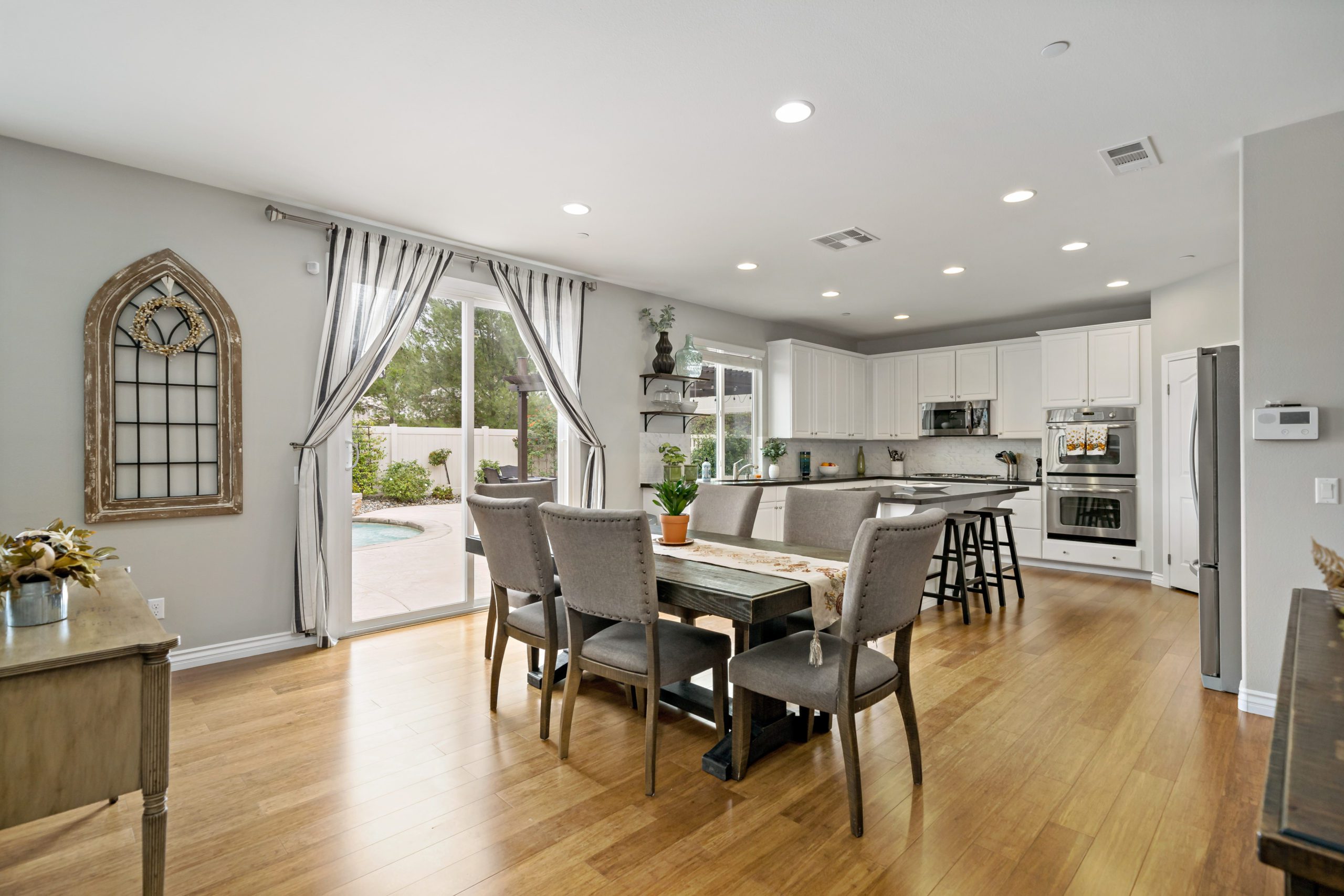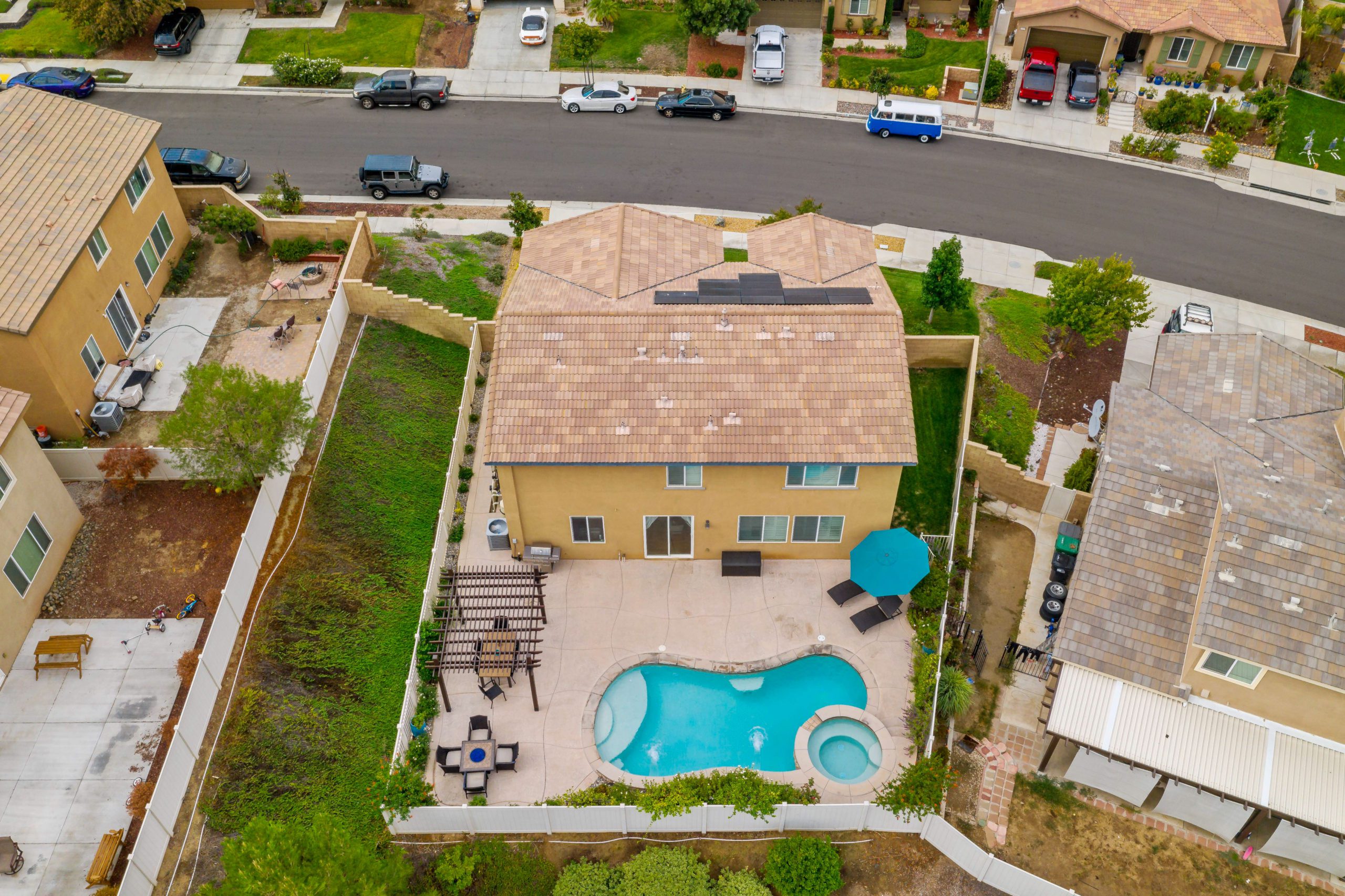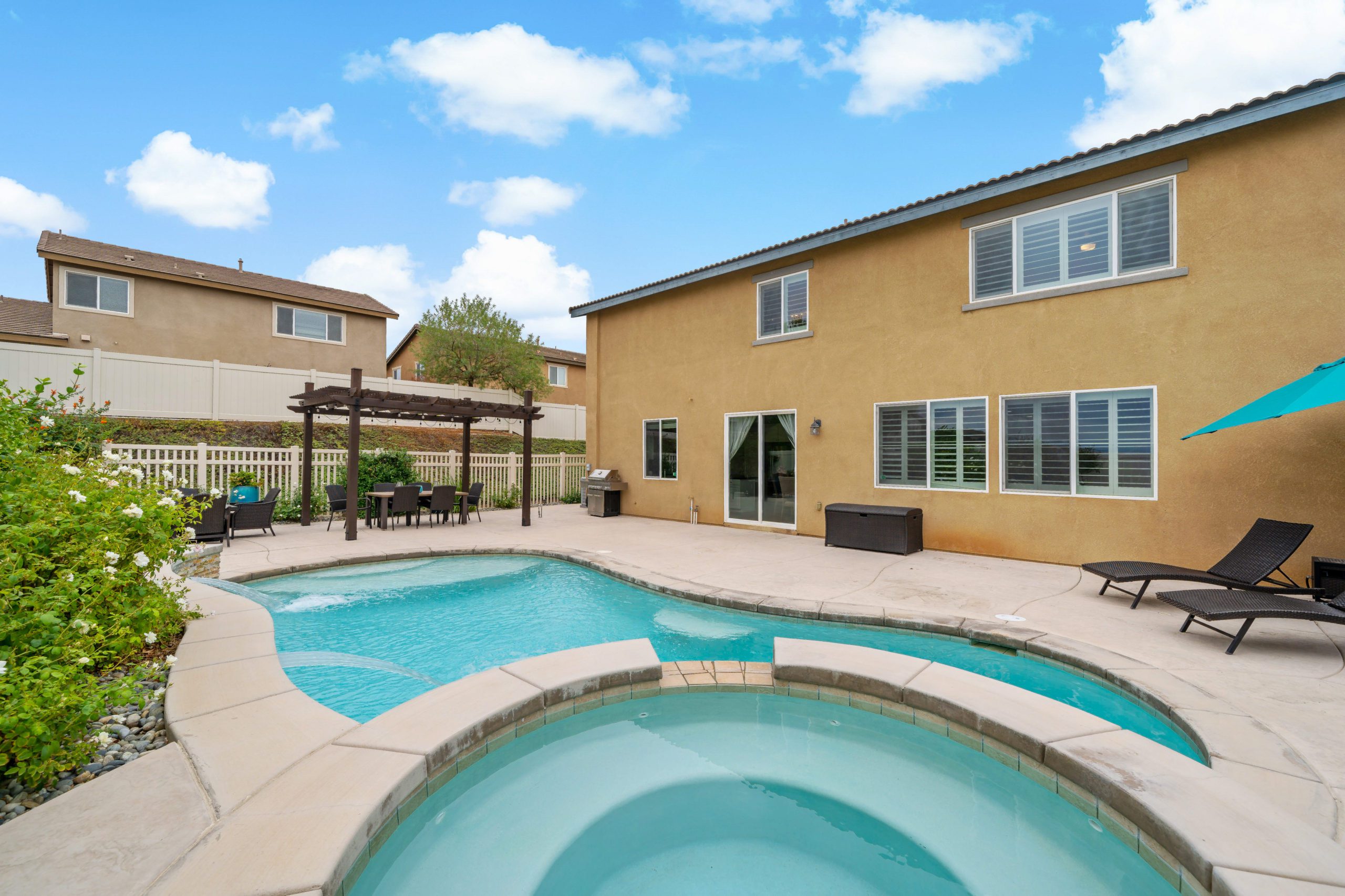 Welcome to the highly desirable community of Rancho Bella Vista. Newer POOL home with partial mountain VIEWS. Enjoy all of the renovations and upgrades this amazing home has to offer. No detail overlooked with this extremely versatile floor plan featuring a downstairs bedroom and full bath, office with gorgeous glass double door entry and upstairs loft. Plantation shutters and newer flooring throughout. Enjoy the entertainer’s dream of a kitchen with quartz counters, white cabinetry, walk-in pantry, center island and stainless steel appliances. The interior was painted less than one year ago. Crown molding in many rooms. The upstairs primary suite has another exceptionally appointed glass door entry into the bath area which includes a generously sized walk-in closet, separate soaking tub, walk-in shower and dual vanity sinks. The pool/spa are salt water with added water features. This backyard is ideal for entertaining including the free standing pergola along with option to add an outdoor kitchen (fully plumbed for gas and electric). Newer landscaping, side dog run, 3-car (tandem) garage and fully owned solar panels. Close proximity to award-winning Temecula schools including Alamos Elementary and Bella Vista Middle School. Rancho Bella Vista POOL Home