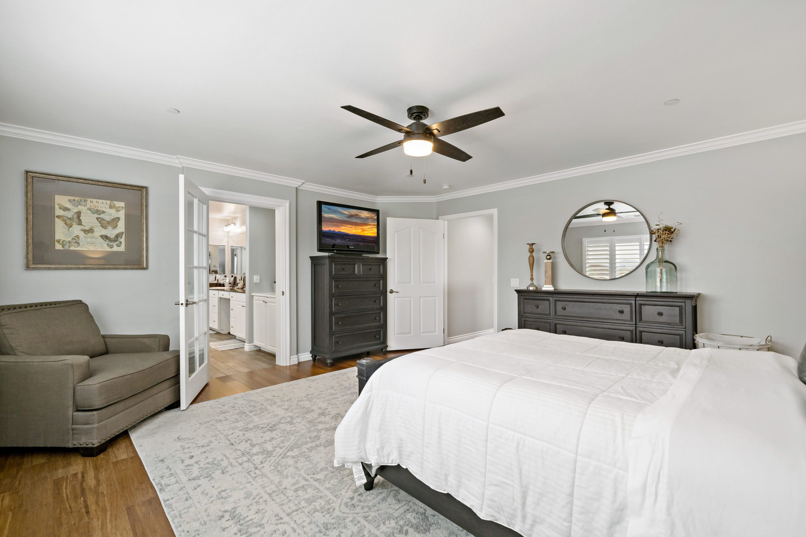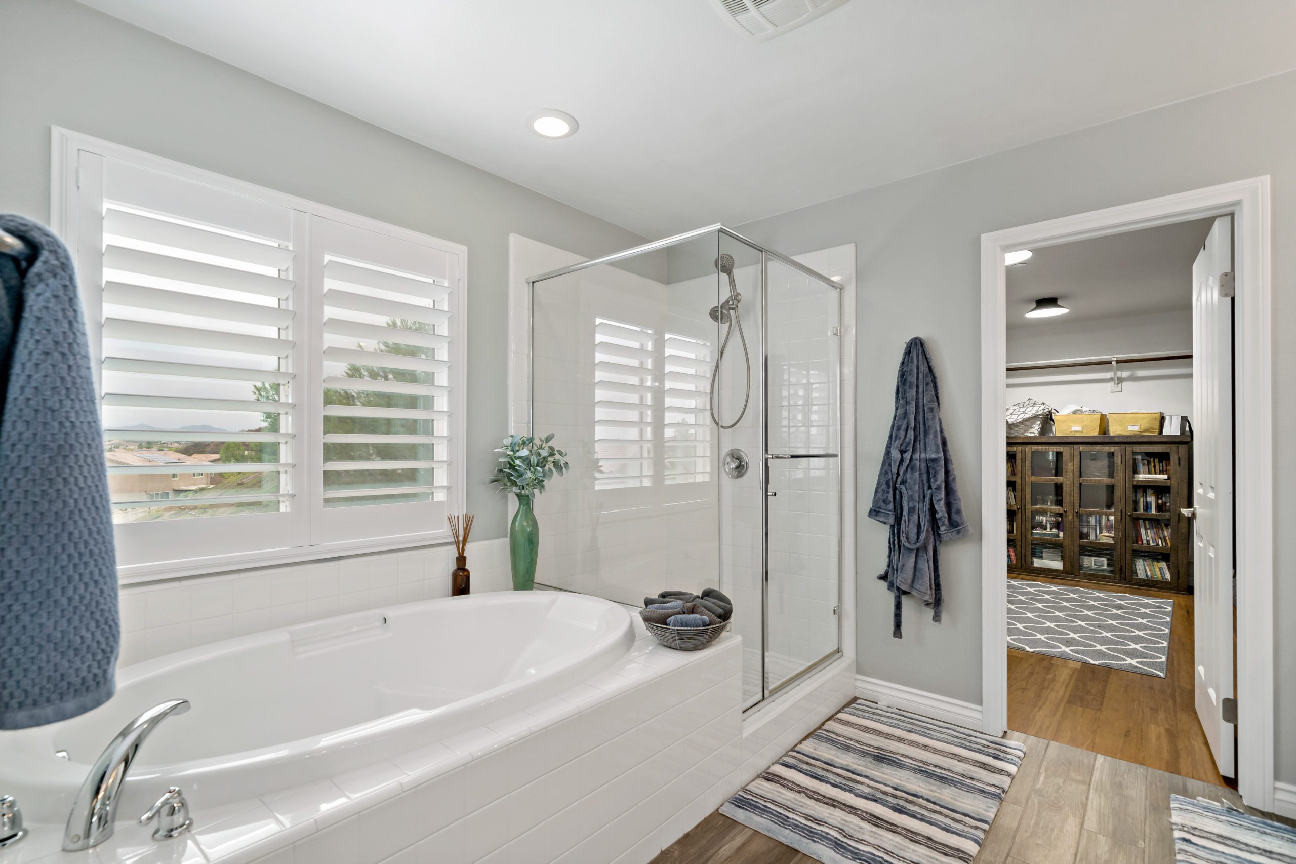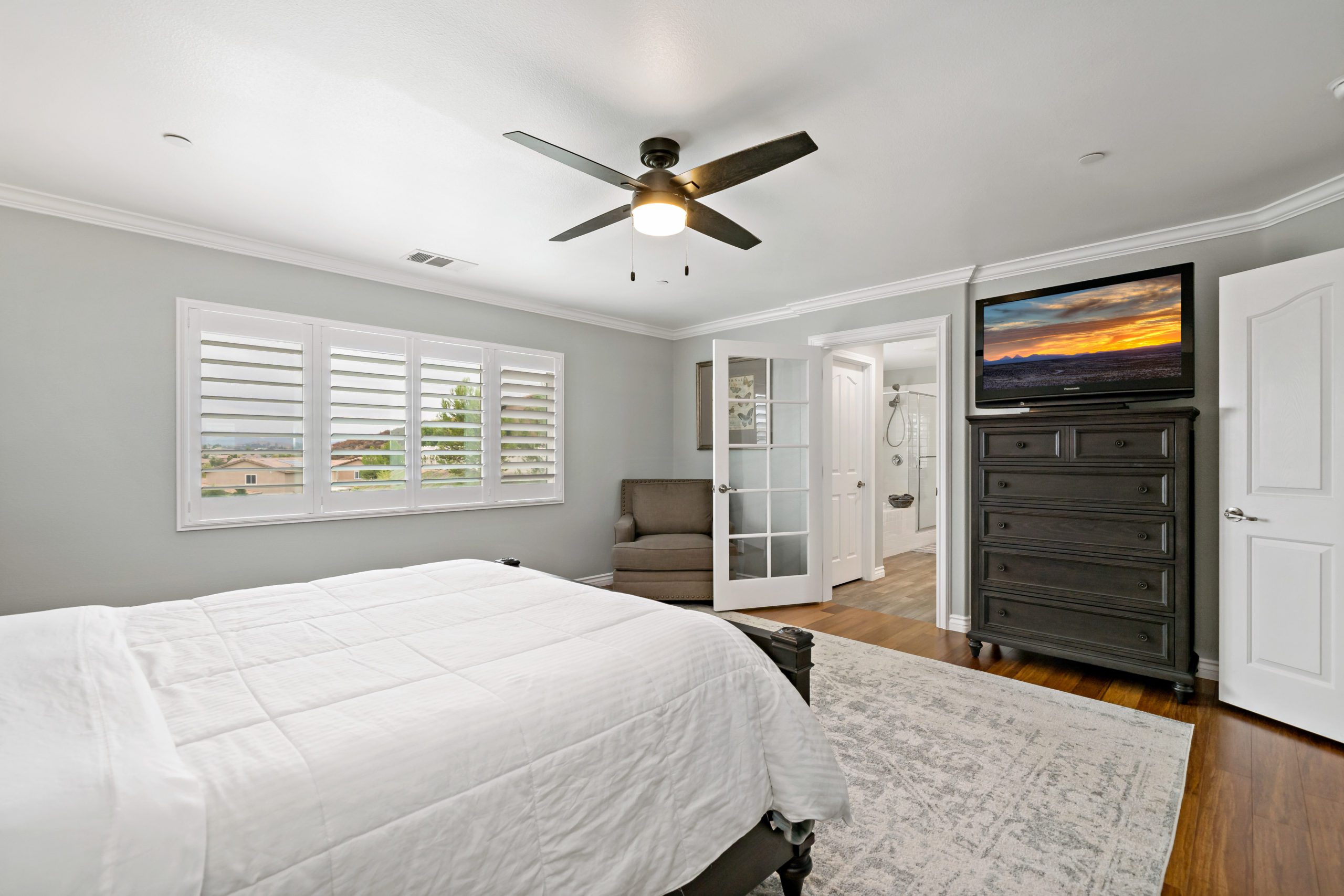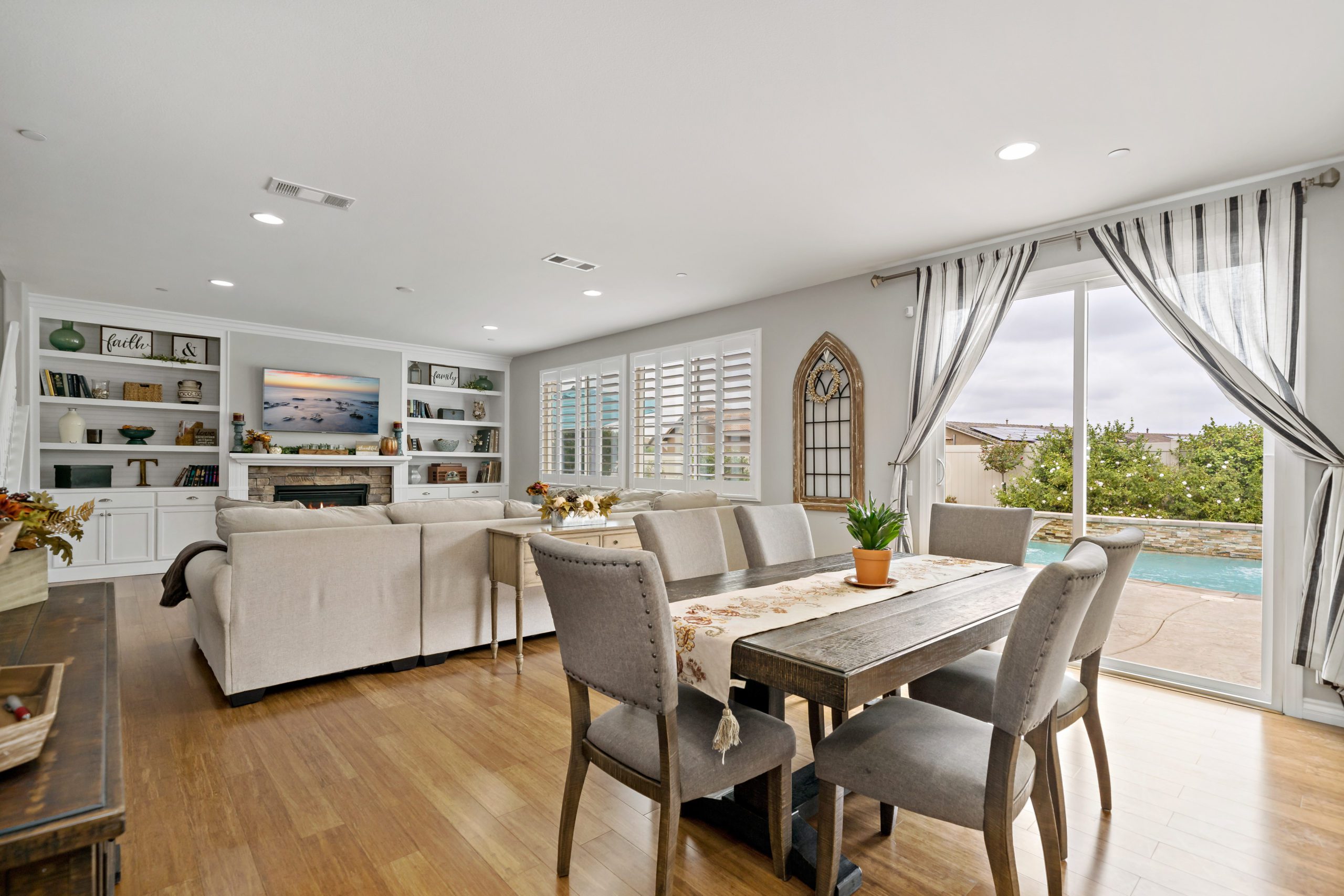 Rancho Bella Vista POOL Home. Welcome to the highly desirable community of Rancho Bella Vista. Newer POOL home with partial mountain VIEWS. Enjoy all of the renovations and upgrades this amazing home has to offer. No detail overlooked with this extremely versatile floor plan featuring a downstairs bedroom and full bath, office with gorgeous glass double door entry and upstairs loft. Plantation shutters and newer flooring throughout. Enjoy the entertainer’s dream of a kitchen with quartz counters, white cabinetry, walk-in pantry, center island and stainless steel appliances. The interior was painted less than one year ago. Crown molding in many rooms. The upstairs primary suite has another exceptionally appointed glass door entry into the bath area which includes a generously sized walk-in closet, separate soaking tub, walk-in shower and dual vanity sinks. The pool/spa are salt water with added water features. This backyard is ideal for entertaining including the free standing pergola along with option to add an outdoor kitchen (fully plumbed for gas and electric). Newer landscaping, side dog run, 3-car (tandem) garage and fully owned solar panels. Close proximity to award-winning Temecula schools including Alamos Elementary and Bella Vista Middle School. Convenient to interstates, sports park, recreation center, interstates, local wineries and dining. Low taxes and low HOA. You won’t want to miss this one. Call today to schedule your tour!