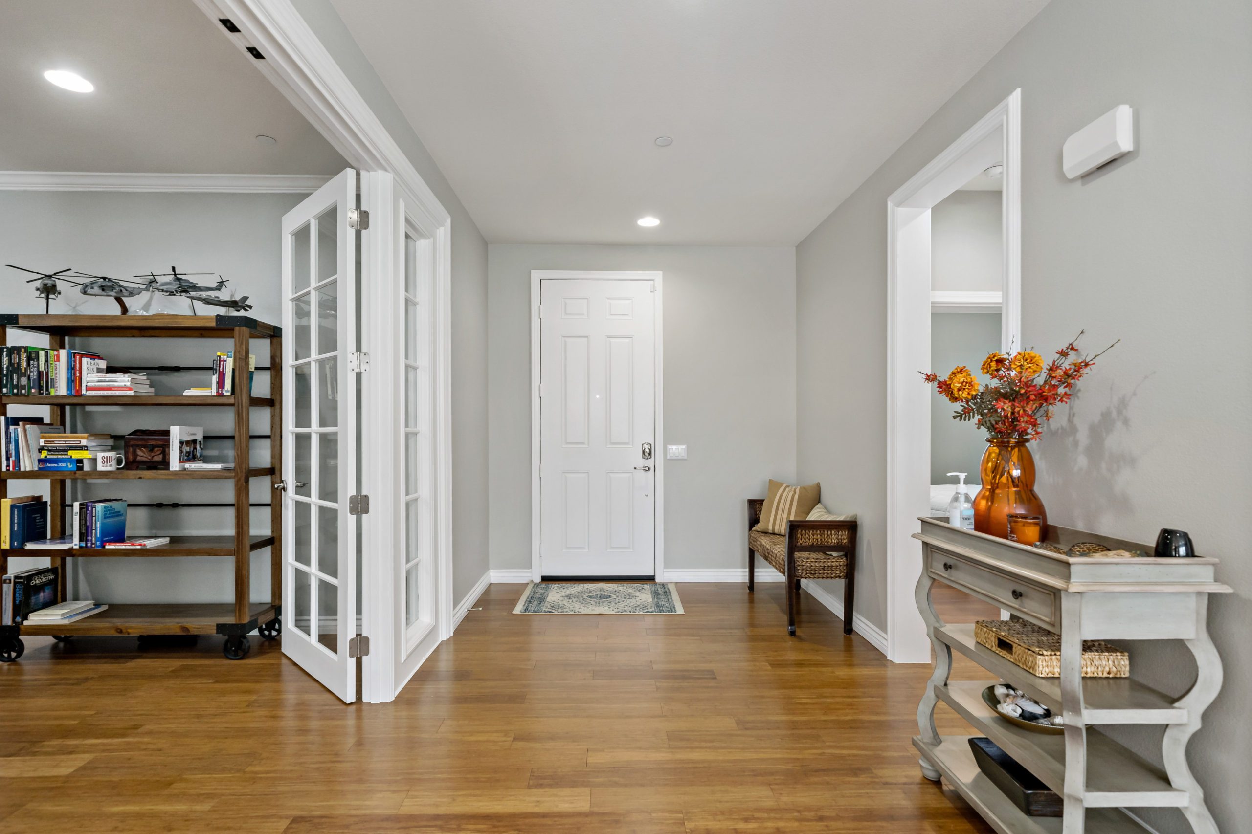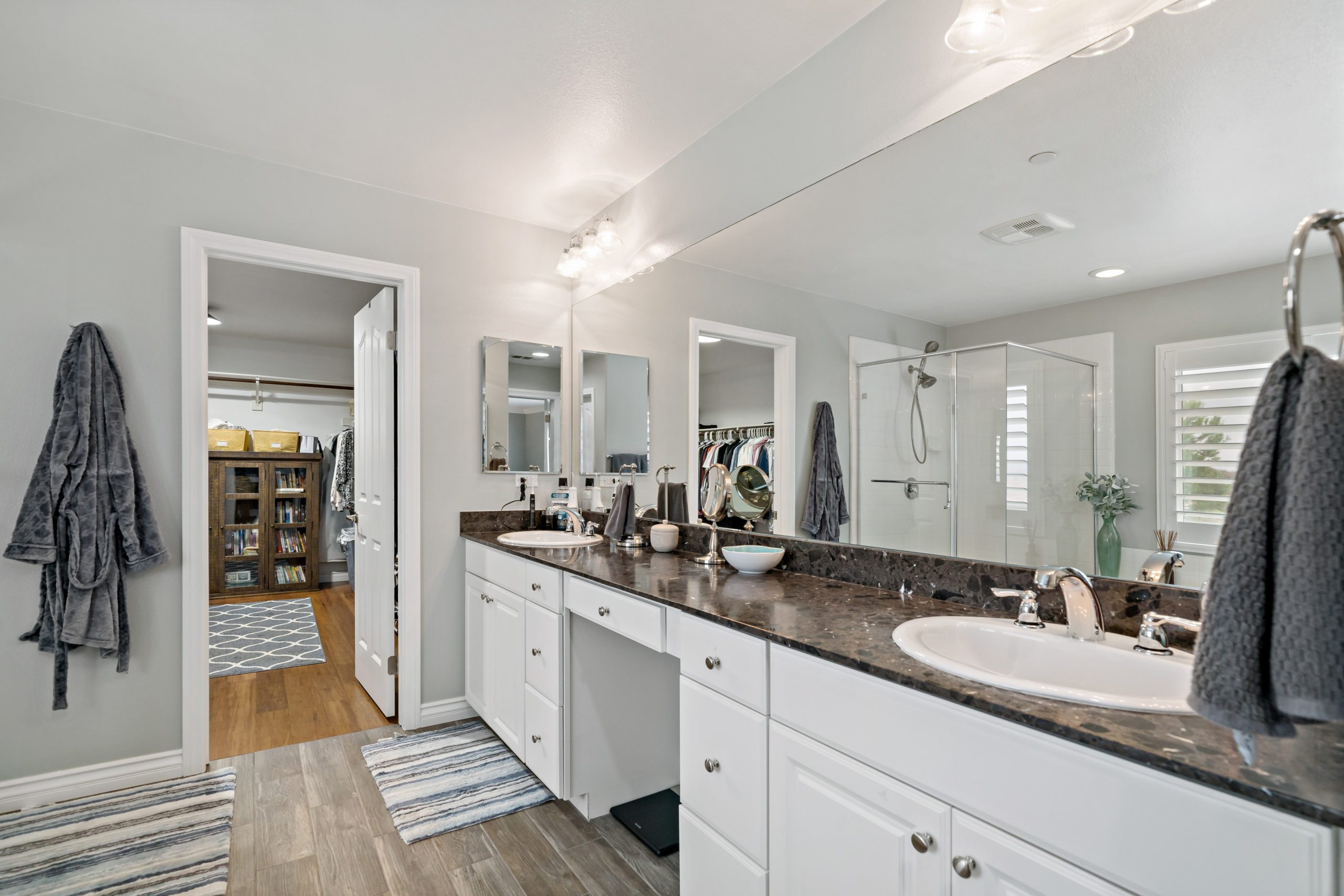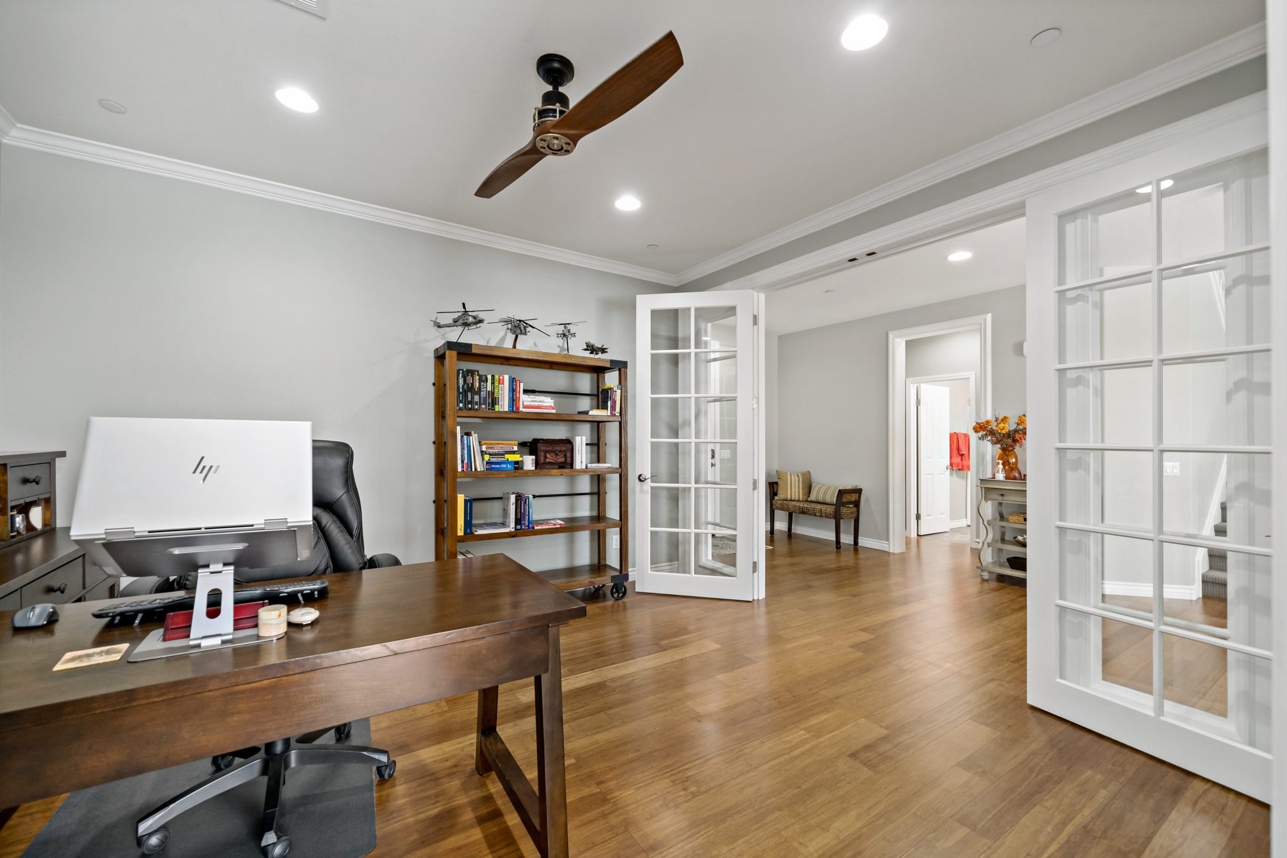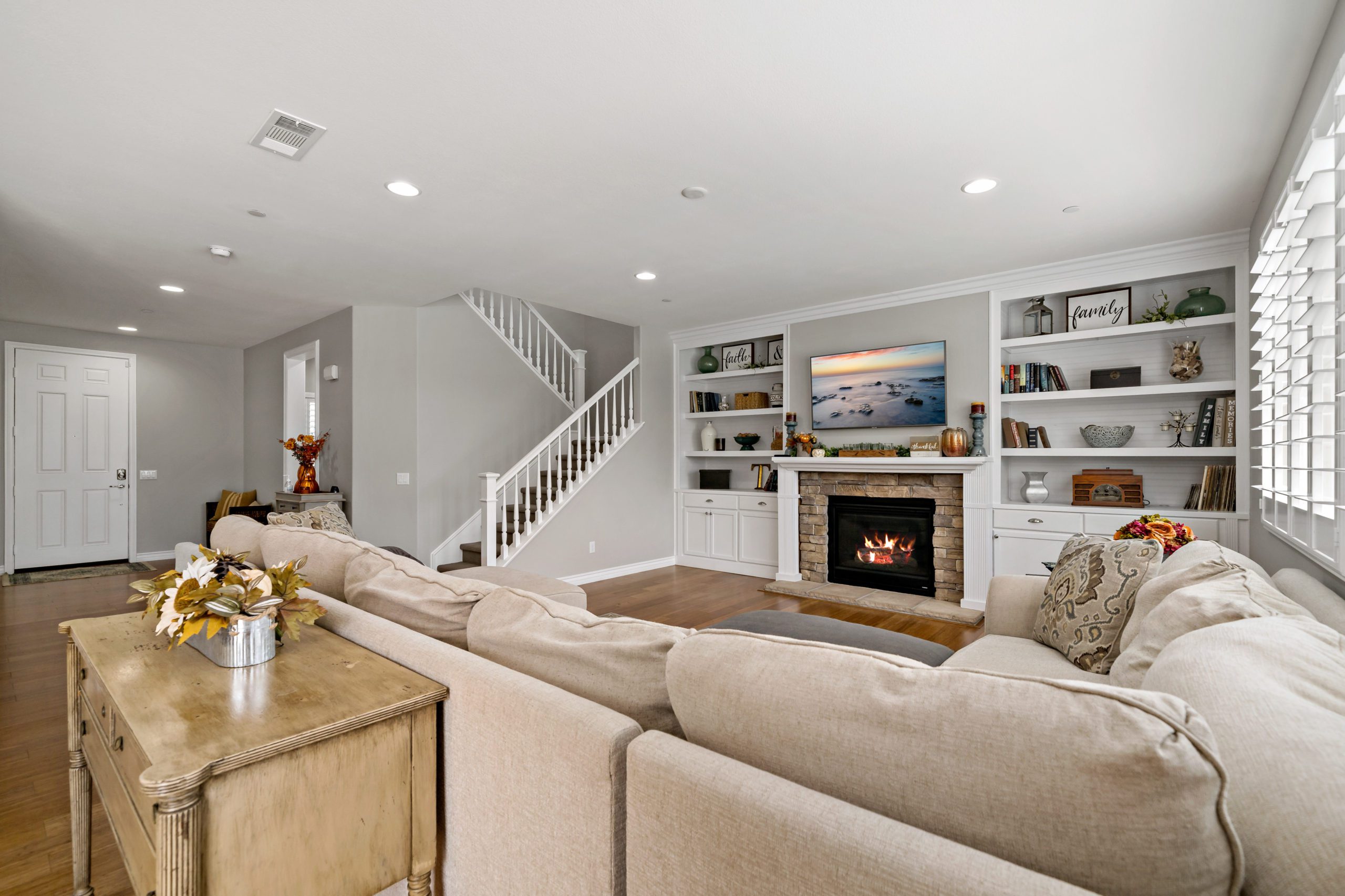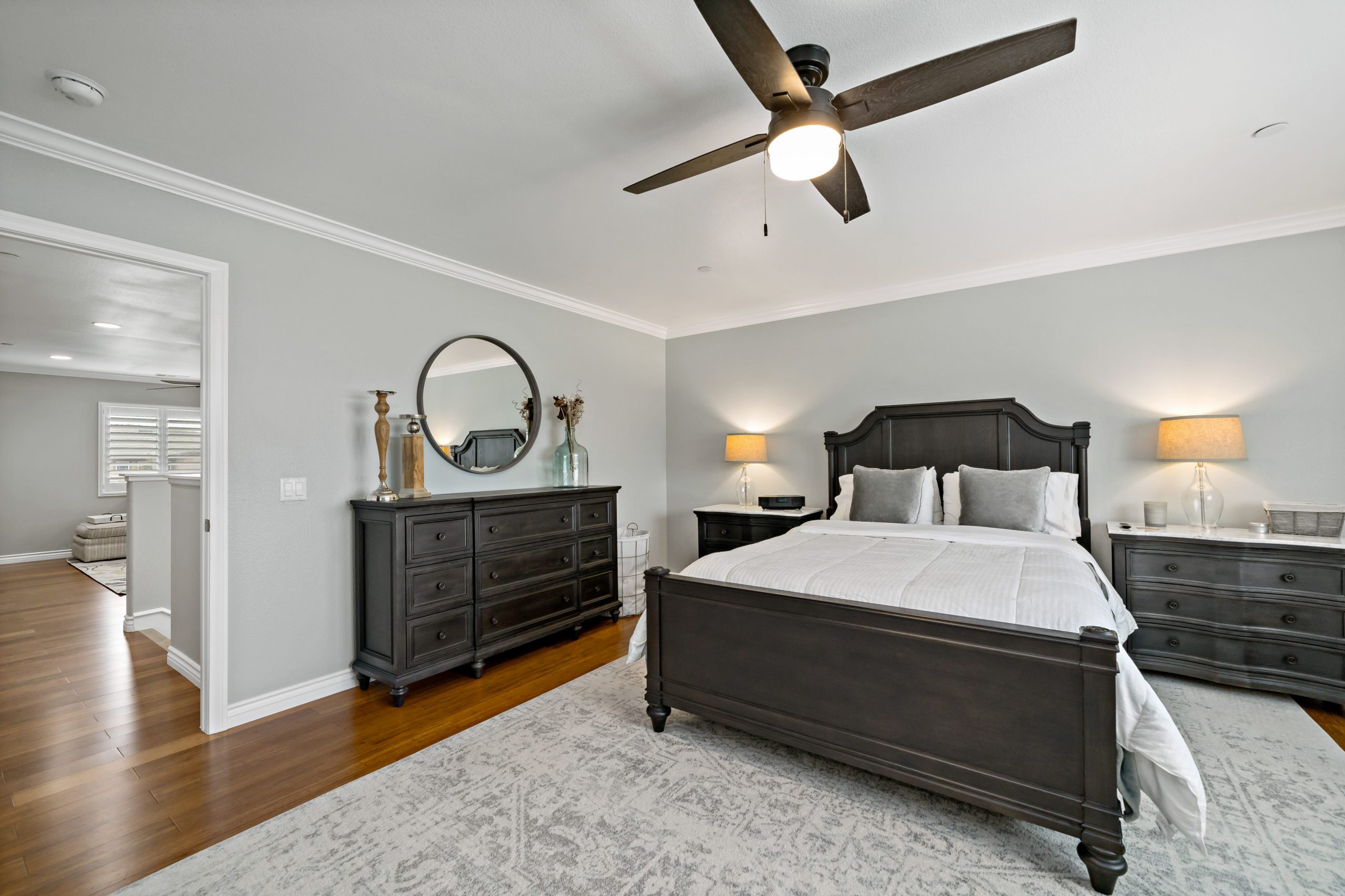 Rancho Bella Vista POOL Home. Welcome to the highly desirable community of Rancho Bella Vista. Newer POOL home with partial mountain VIEWS. Enjoy all of the renovations and upgrades this amazing home has to offer. No detail overlooked with this extremely versatile floor plan featuring a downstairs bedroom and full bath, office with gorgeous glass double door entry and upstairs loft. Plantation shutters and newer flooring throughout. Enjoy the entertainer’s dream of a kitchen with quartz counters, white cabinetry, walk-in pantry, center island and stainless steel appliances. The interior was painted less than one year ago. Crown molding in many rooms. The upstairs primary suite has another exceptionally appointed glass door entry into the bath area which includes a generously sized walk-in closet, separate soaking tub, walk-in shower and dual vanity sinks. The pool/spa are salt water with added water features. This backyard is ideal for entertaining including the free standing pergola along with option to add an outdoor kitchen (fully plumbed for gas and electric). Newer landscaping, side dog run, 3-car (tandem) garage and fully owned solar panels. Close proximity to award-winning Temecula schools including Alamos Elementary and Bella Vista Middle School. Convenient to interstates, sports park, recreation center, interstates, local wineries and dining. Low taxes and low HOA. You won’t want to miss this one. Call today to schedule your tour!