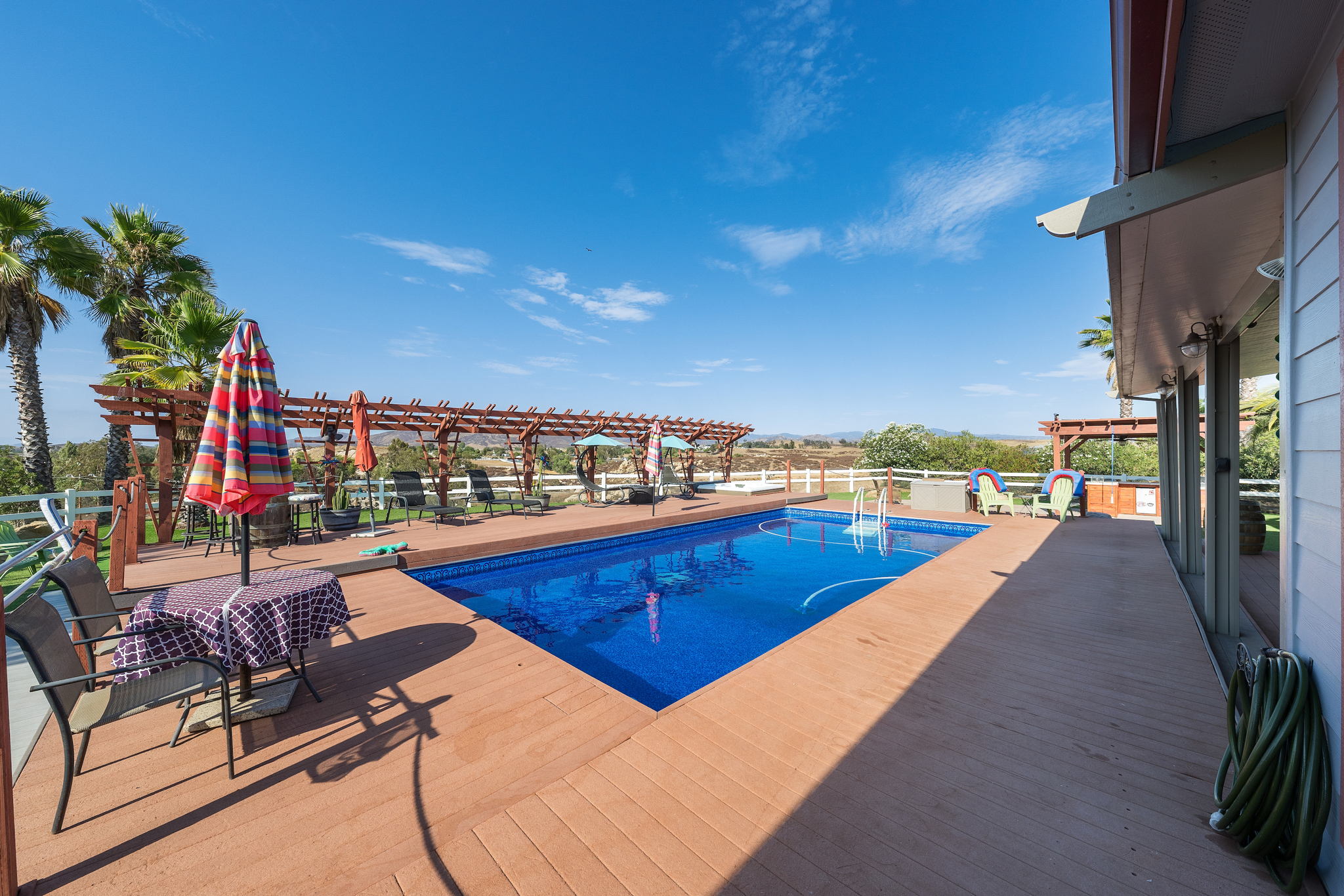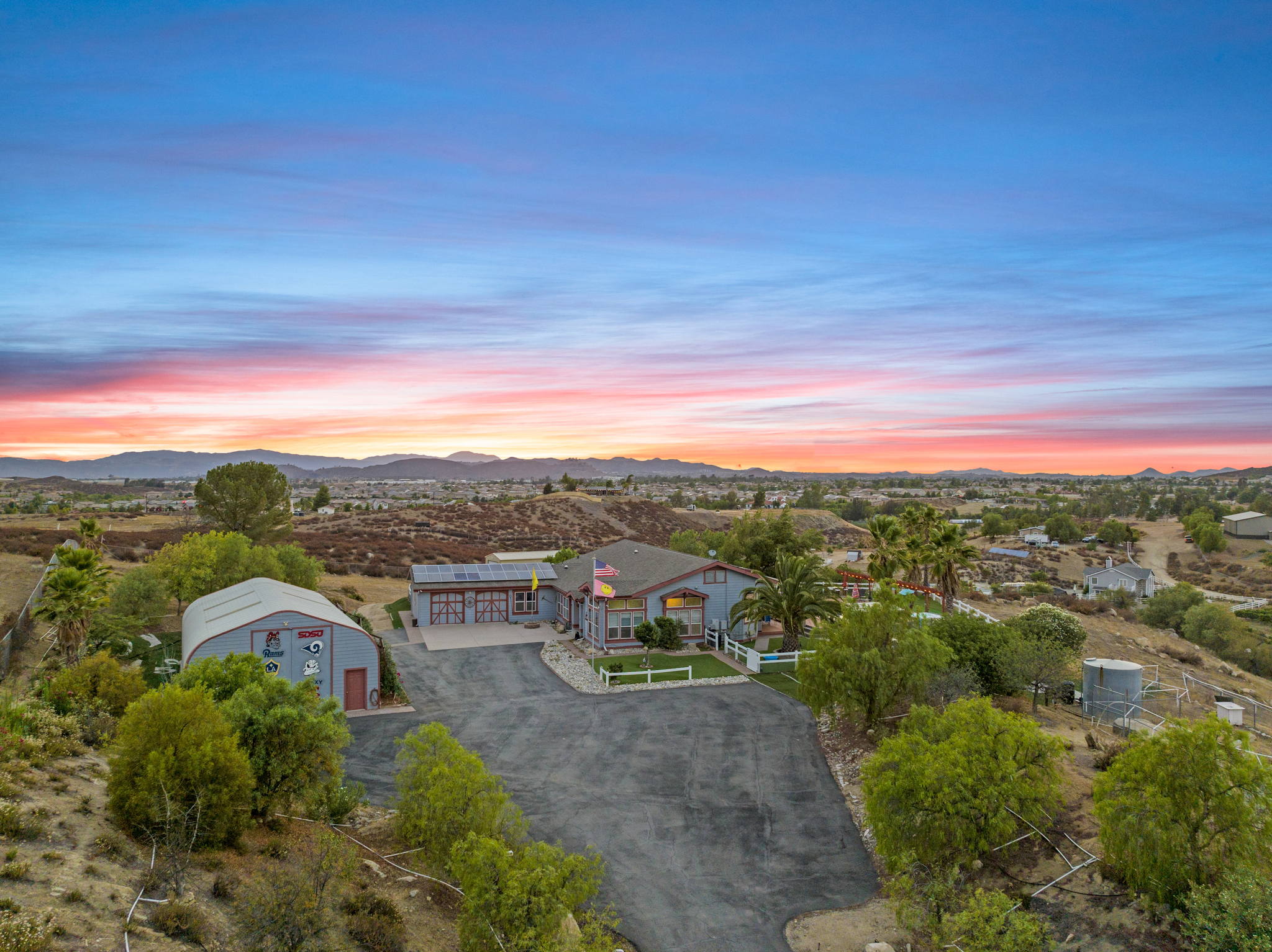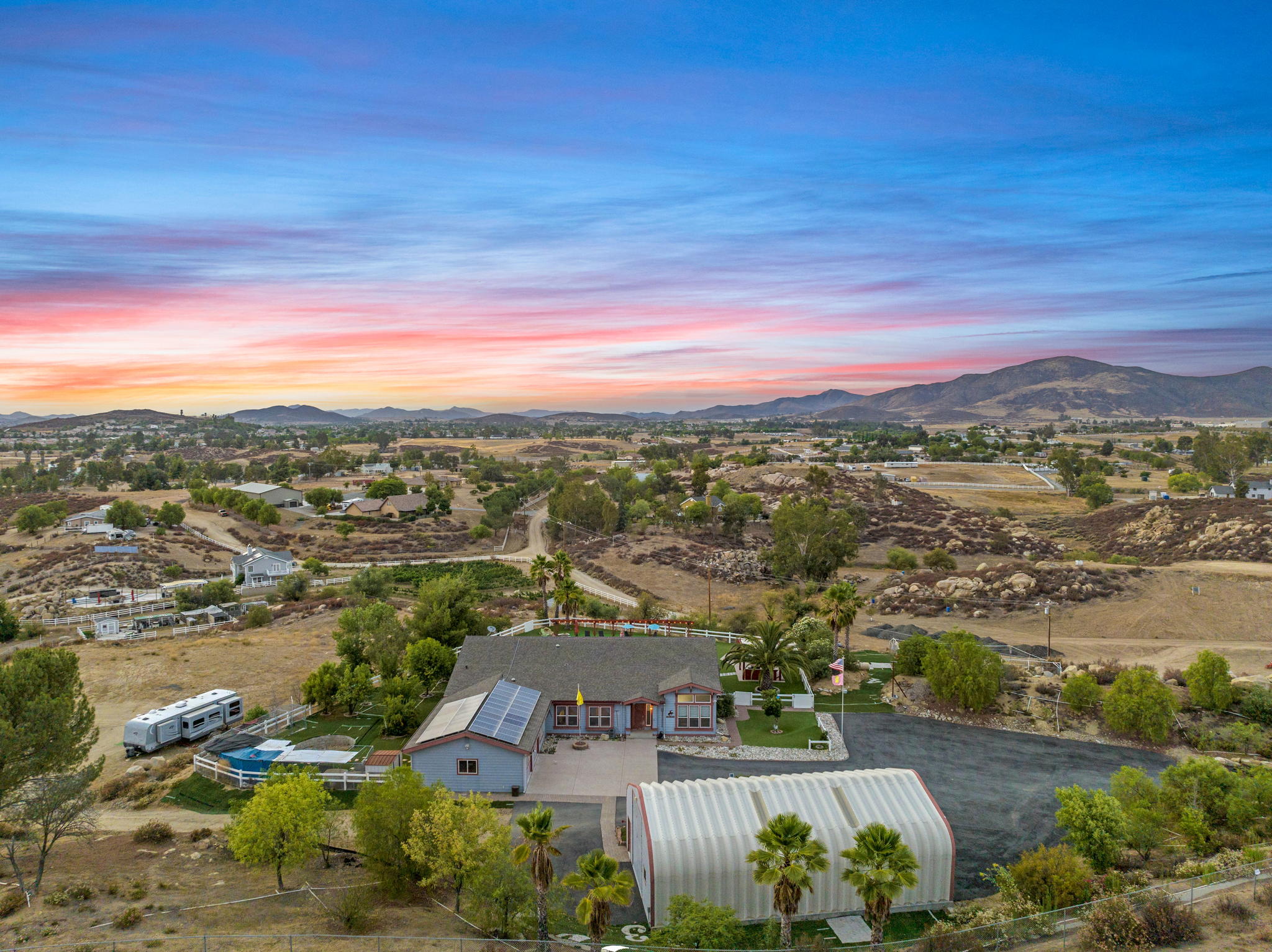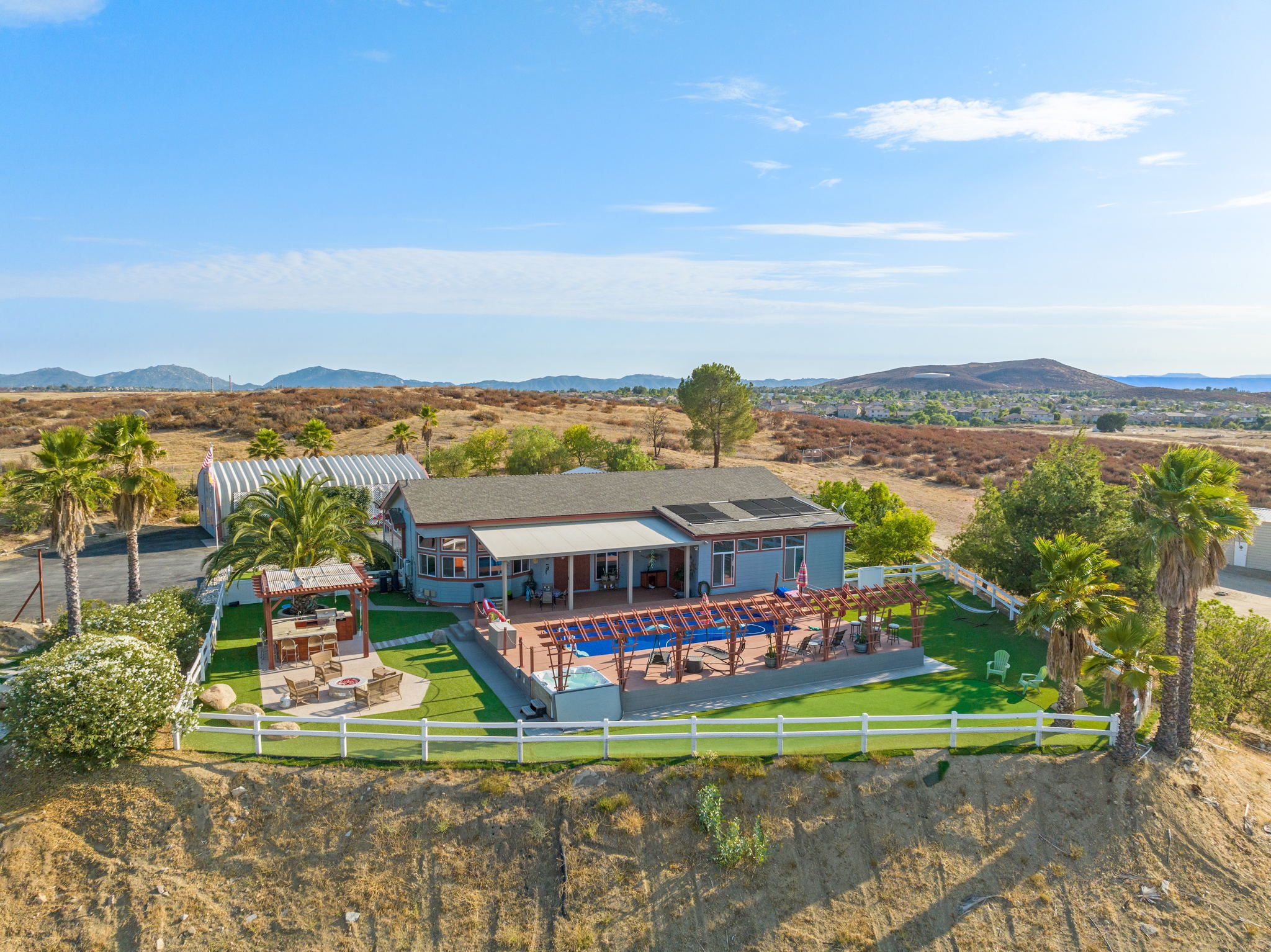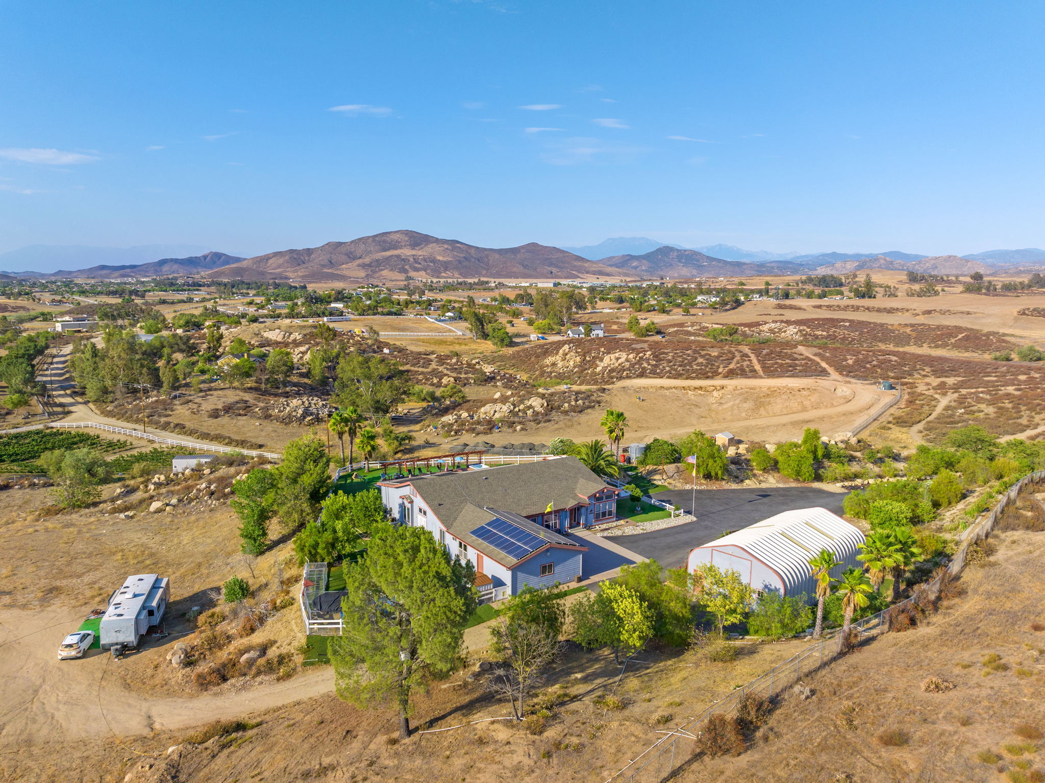 The spectacular panoramic view home you’ve been waiting for-this is it! Imagine looking at snow capped mountains in the winter while taking in the breathtaking spectacular panoramic VIEWS! This recently renovated SINGLE STORY beauty is everything an owner seeking substantial land with gated entry could dream of! From point of living room entry, you’ll fall in love with the newer wide vinyl plank flooring which opens up to the sizable great room which then flows into the upgraded kitchen featuring large center island, double ovens, farmhouse sink, custom walk-in pantry with counters and views of those amazing mountains. The owner’s retreat is generously sized and has a built-in dresser, walk-in closet, corner soaking tub, separate step-in shower with 2 heads and dual vanity sinks. All baths have been renovated over the past couple years. Fresh interior paint in most rooms, too. The great room with custom built-ins and an relaxing fireplace creates that perfect ambiance for enjoying our chilly Temecula Valley evenings. Imagine having your own pool, Trex decking, above ground spa, kennels, artificial turf, airplane hangar (with 30X50′ doors opening on each end) along with an RV garage complete with full hook ups. The “extra” are endless including Bocce ball court, firepit, built-in barbeque and there’s even a fruit tree orchard. This home also has a whole house fan and 30 solar panels under a Power Purchase Agreement. Imagine no sewer bill, no water bill and reduced electricity bills. This home is move in ready and ready for it’s right fit buyer who needs plenty of space to expand, play and entertain. Conveniently located near award-winning Temecula schools, interstates and popular wineries. Call to schedule to your tour today!