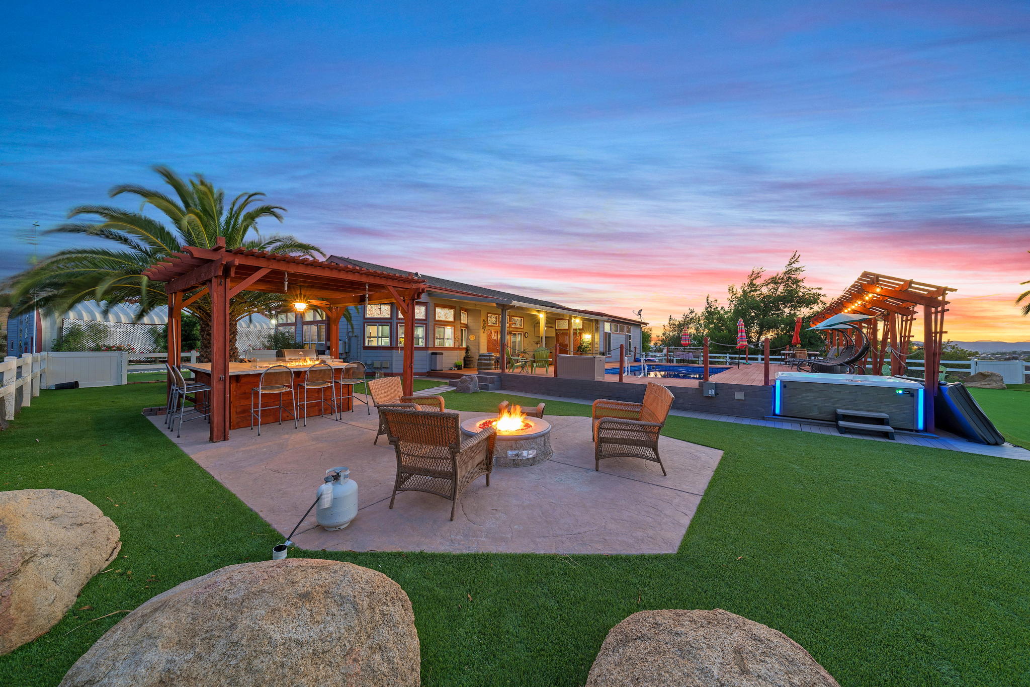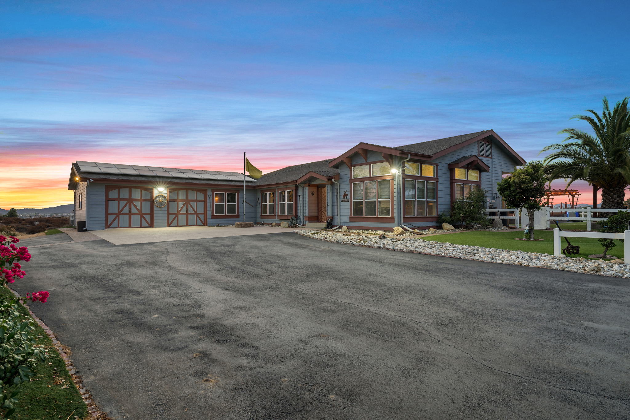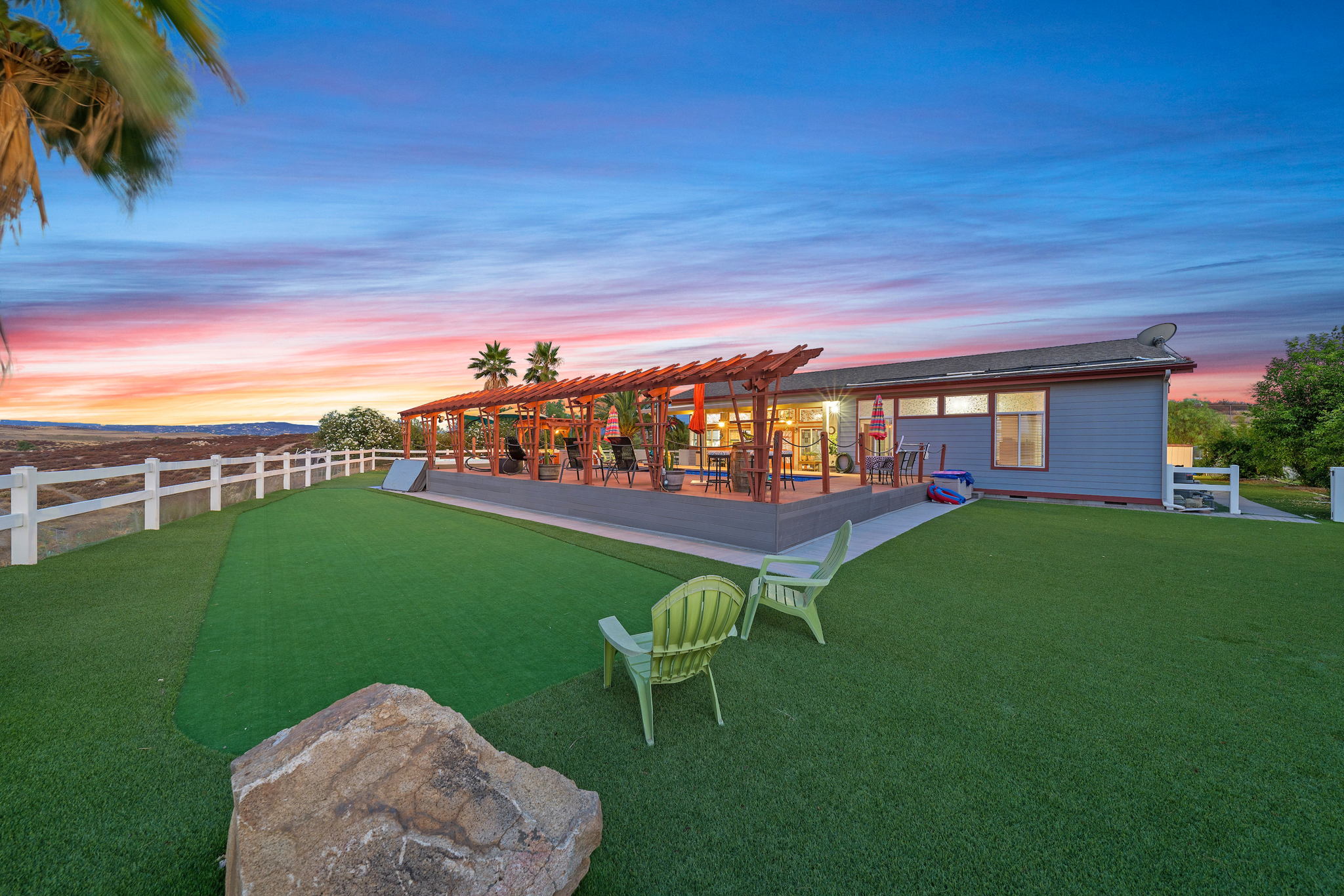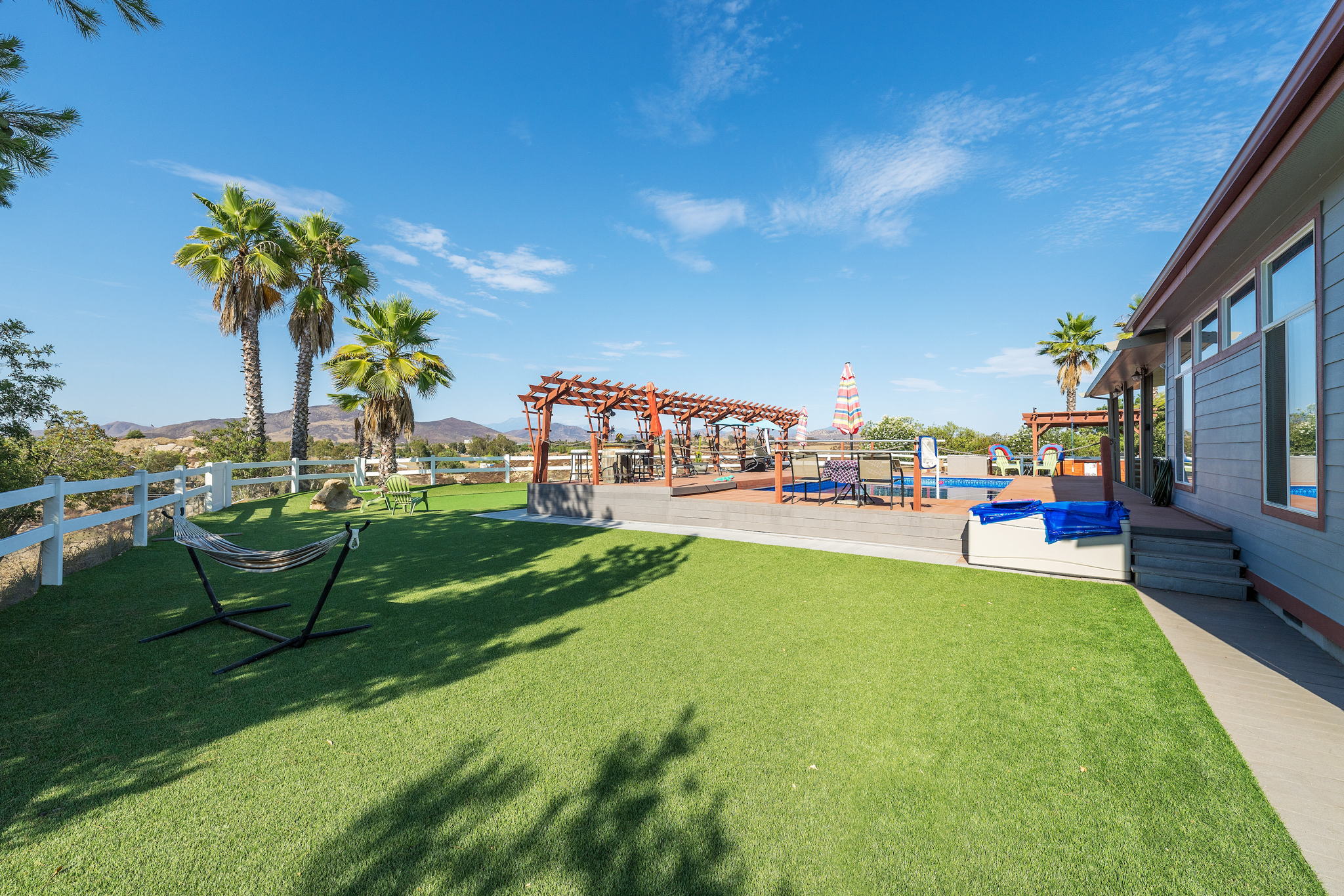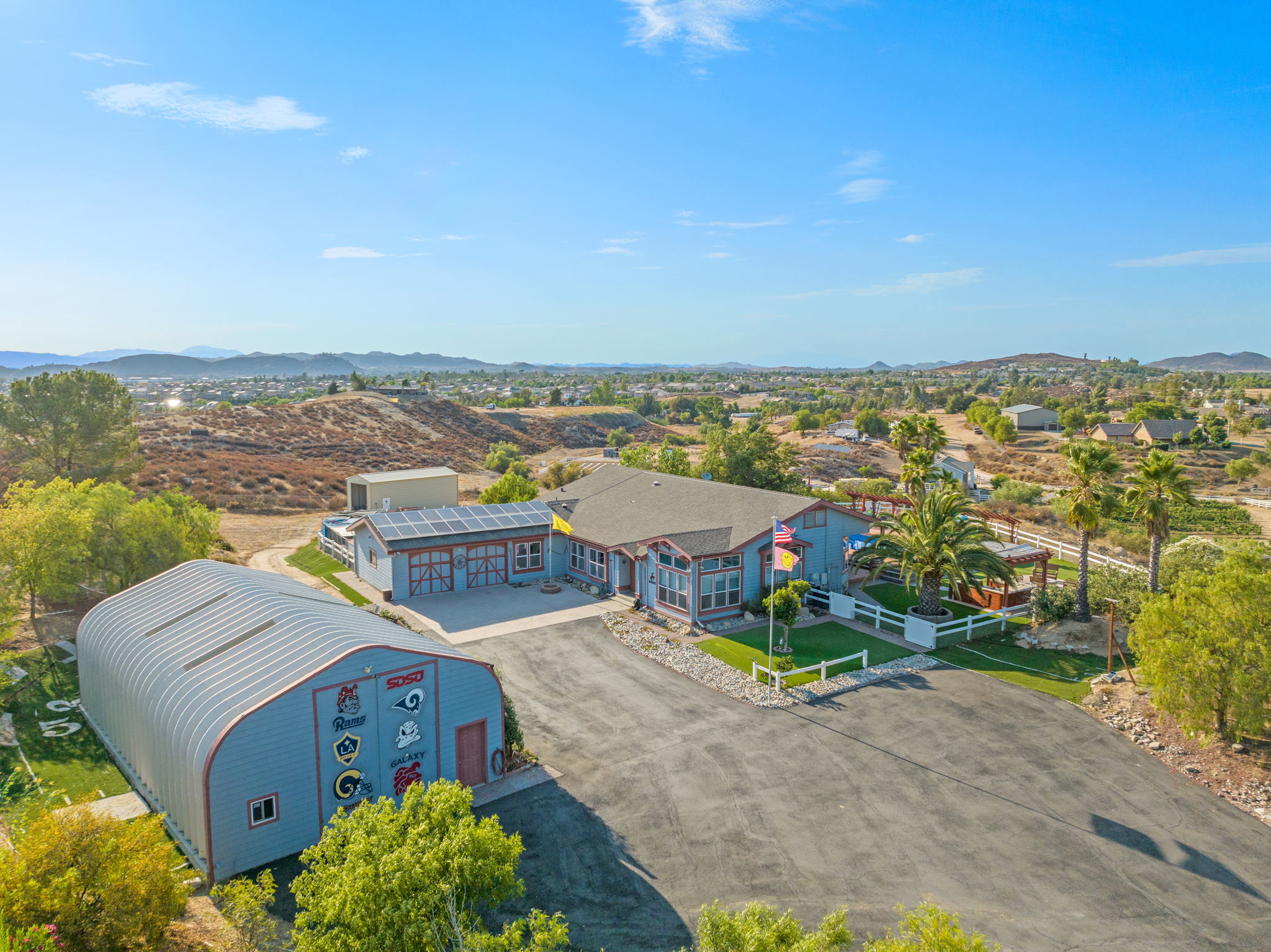 The spectacular panoramic view home you’ve been waiting for-this is it! Imagine looking at snow capped mountains in the winter while taking in the breathtaking spectacular panoramic VIEWS! This recently renovated SINGLE STORY beauty is everything an owner seeking substantial land with gated entry could dream of! From point of living room entry, you’ll fall in love with the newer wide vinyl plank flooring which opens up to the sizable great room which then flows into the upgraded kitchen featuring large center island, double ovens, farmhouse sink, custom walk-in pantry with counters and views of those amazing mountains. The owner’s retreat is generously sized and has a built-in dresser, walk-in closet, corner soaking tub, separate step-in shower with 2 heads and dual vanity sinks. All baths have been renovated over the past couple years. Fresh interior paint in most rooms, too. The great room with custom built-ins and an relaxing fireplace creates that perfect ambiance for enjoying our chilly Temecula Valley evenings. Imagine having your own pool, Trex decking, above ground spa, kennels, artificial turf, airplane hangar (with 30X50′ doors opening on each end) along with an RV garage complete with full hook ups. The “extra” are endless including Bocce ball court, firepit, built-in barbeque and there’s even a fruit tree orchard. This home also has a whole house fan and 30 solar panels under a Power Purchase Agreement. Imagine no sewer bill, no water bill and reduced electricity bills. This home is move in ready and ready for it’s right fit buyer who needs plenty of space to expand, play and entertain. Conveniently located near award-winning Temecula schools, interstates and popular wineries. Call to schedule to your tour today!