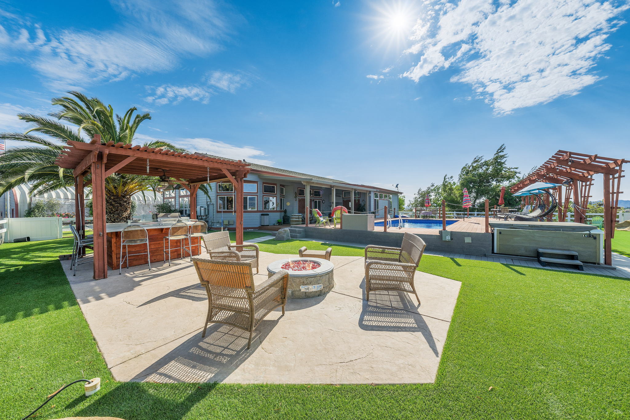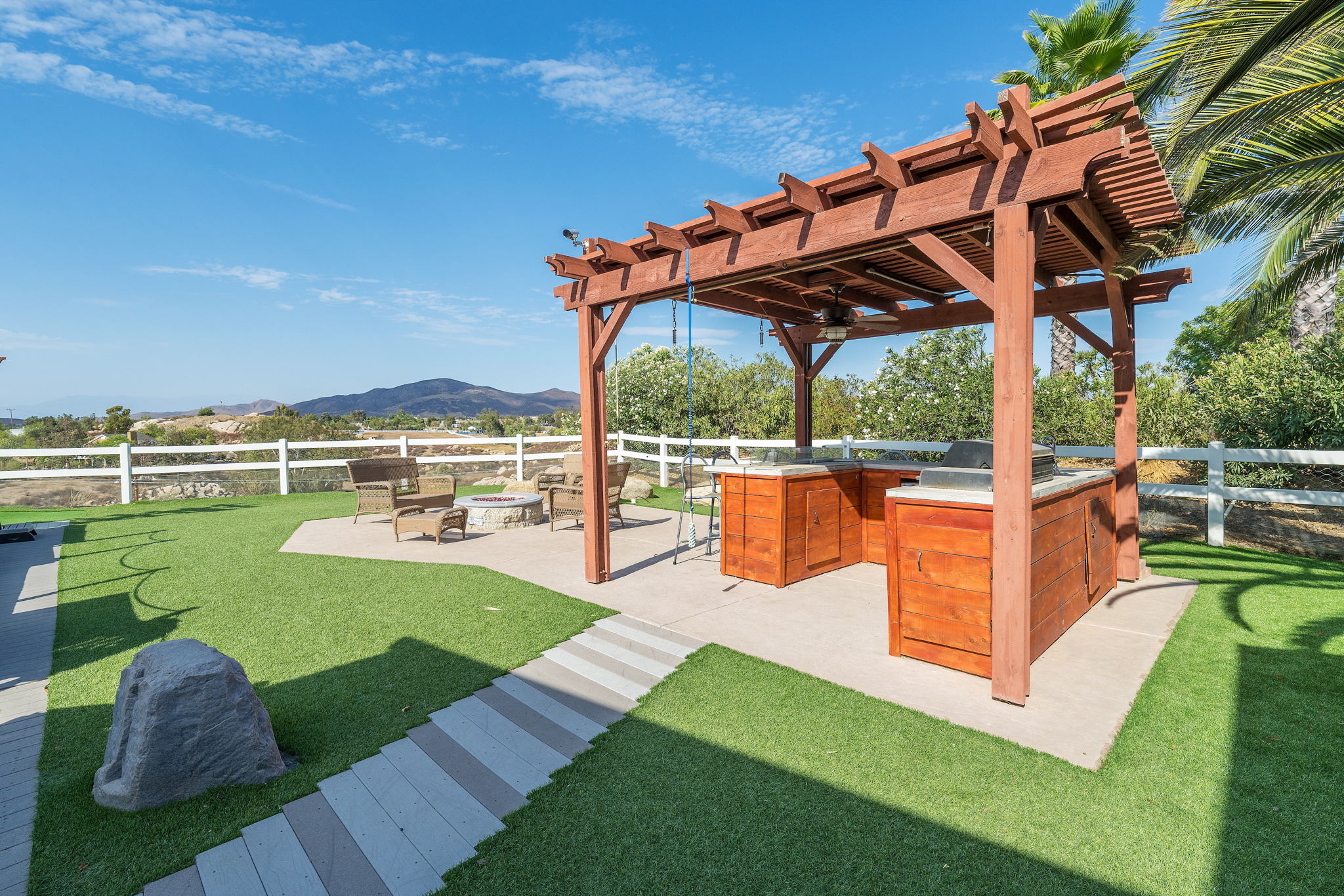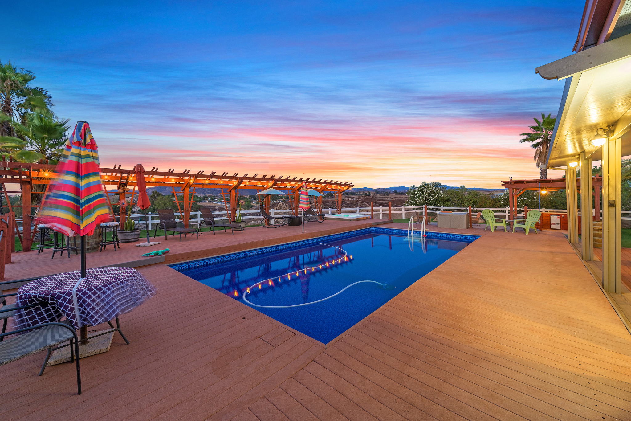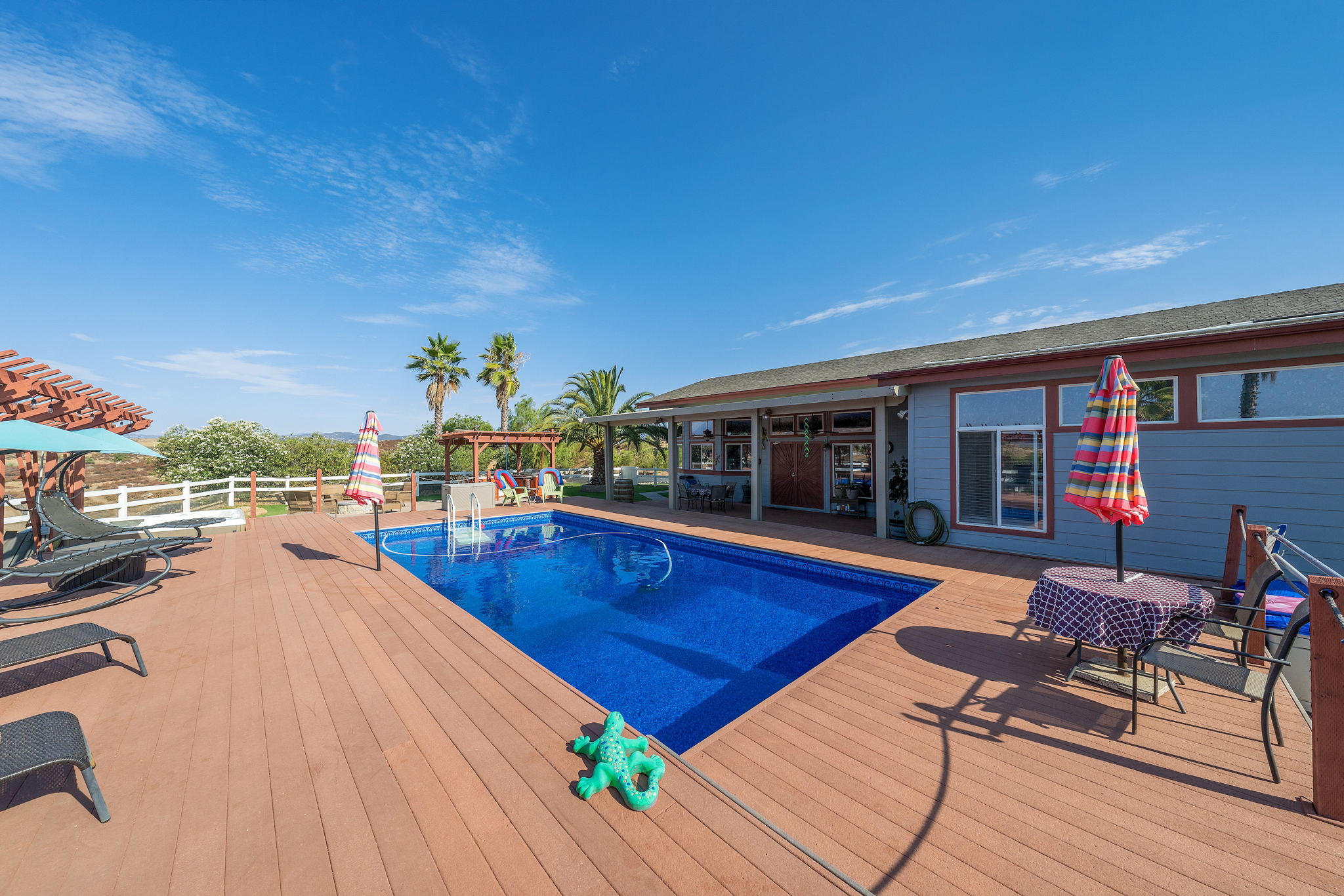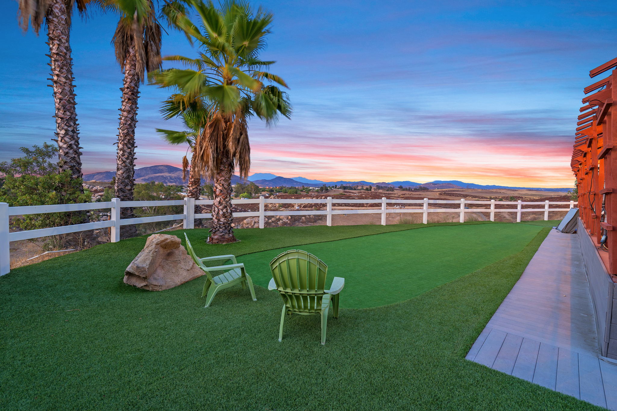 The spectacular panoramic view home you’ve been waiting for-this is it! Imagine looking at snow capped mountains in the winter while taking in the breathtaking spectacular panoramic VIEWS! This recently renovated SINGLE STORY beauty is everything an owner seeking substantial land with gated entry could dream of! From point of living room entry, you’ll fall in love with the newer wide vinyl plank flooring which opens up to the sizable great room which then flows into the upgraded kitchen featuring large center island, double ovens, farmhouse sink, custom walk-in pantry with counters and views of those amazing mountains. The owner’s retreat is generously sized and has a built-in dresser, walk-in closet, corner soaking tub, separate step-in shower with 2 heads and dual vanity sinks. All baths have been renovated over the past couple years. Fresh interior paint in most rooms, too. The great room with custom built-ins and an relaxing fireplace creates that perfect ambiance for enjoying our chilly Temecula Valley evenings. Imagine having your own pool, Trex decking, above ground spa, kennels, artificial turf, airplane hangar (with 30X50′ doors opening on each end) along with an RV garage complete with full hook ups. The “extra” are endless including Bocce ball court, firepit, built-in barbeque and there’s even a fruit tree orchard. This home also has a whole house fan and 30 solar panels under a Power Purchase Agreement. Imagine no sewer bill, no water bill and reduced electricity bills. This home is move in ready and ready for it’s right fit buyer who needs plenty of space to expand, play and entertain. Conveniently located near award-winning Temecula schools, interstates and popular wineries. Call to schedule to your tour today!