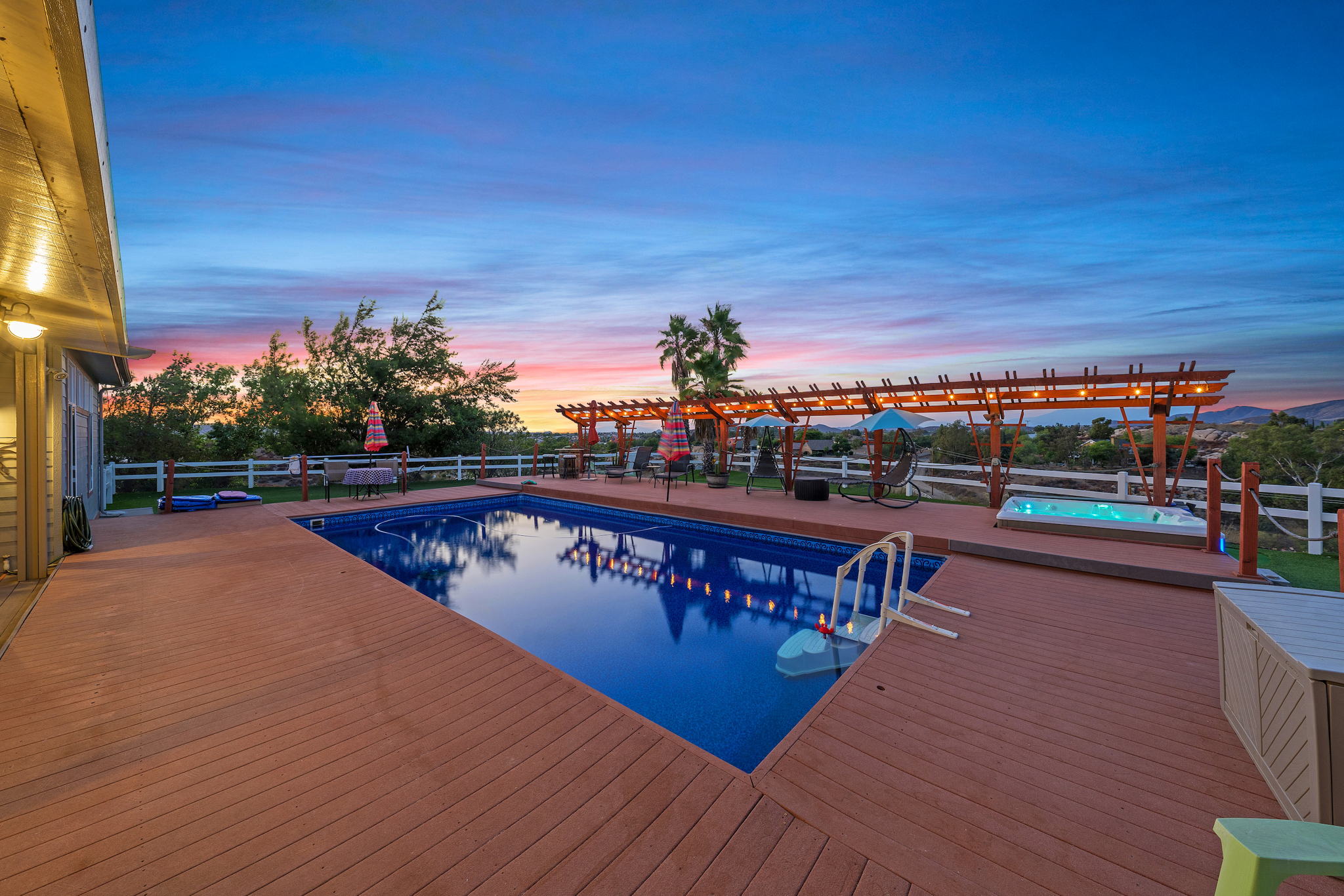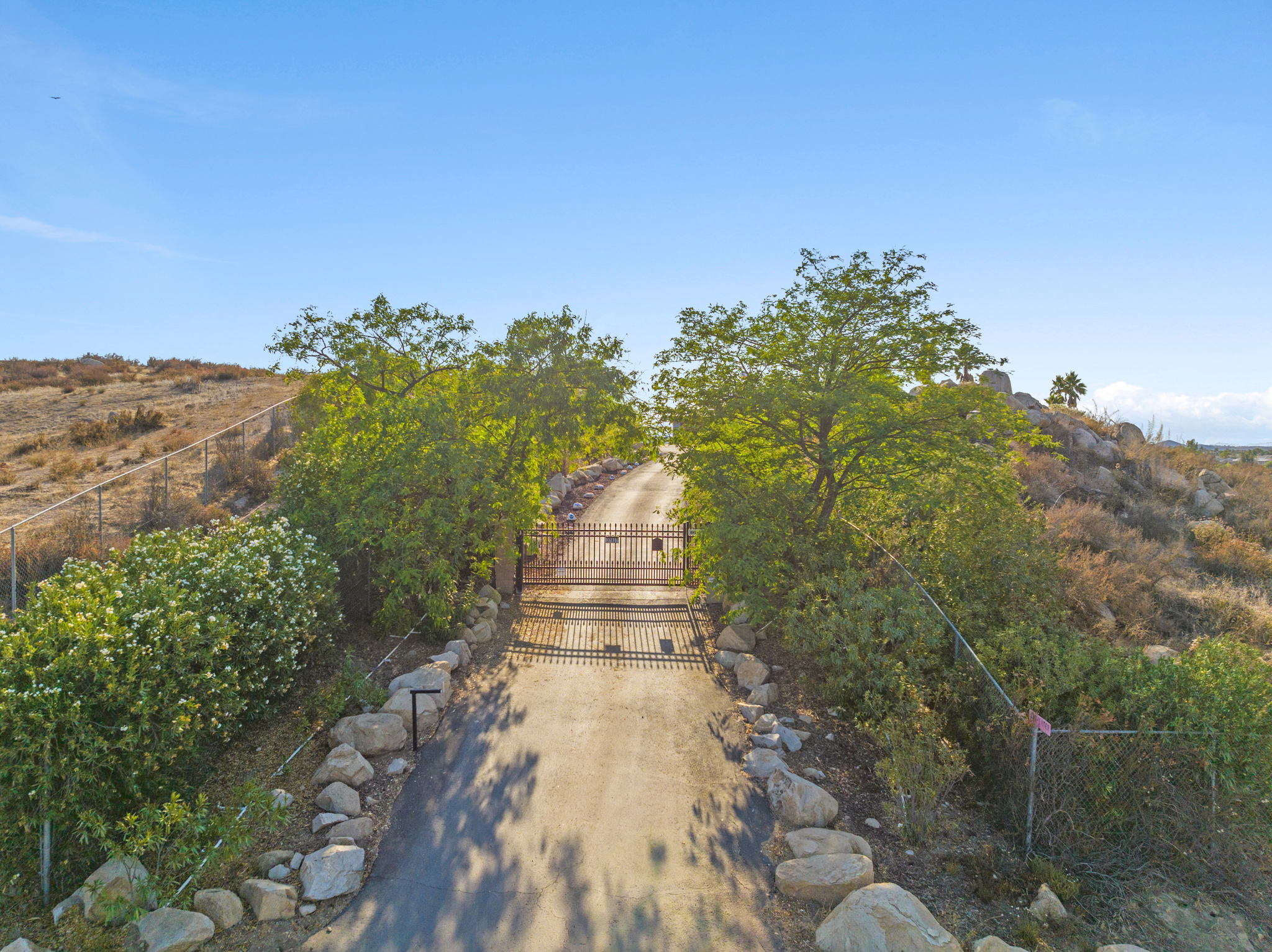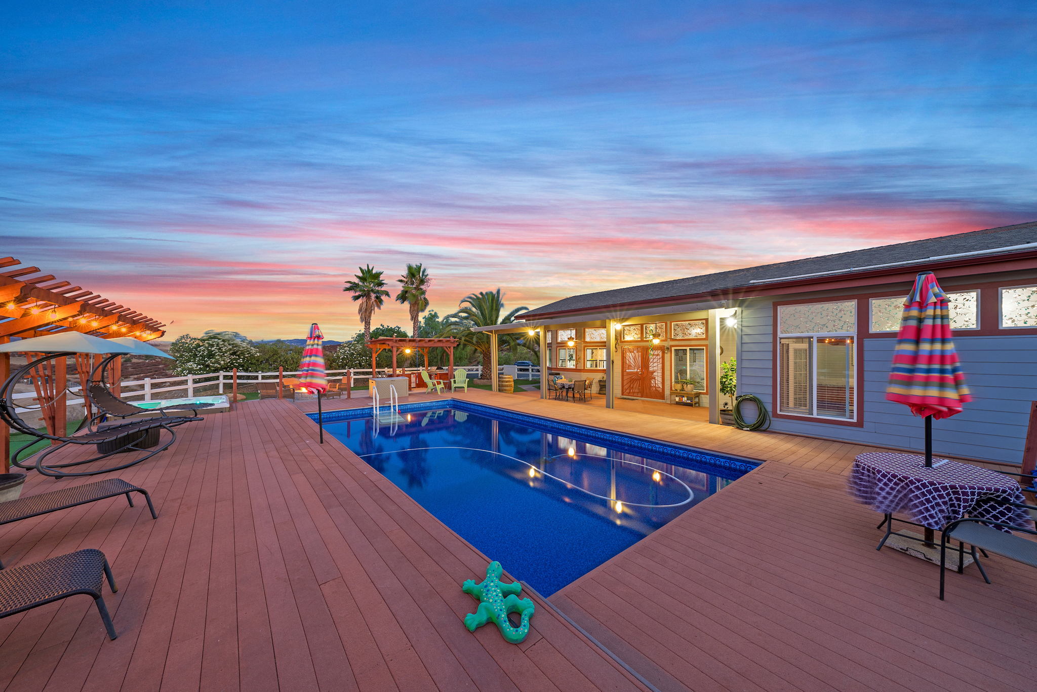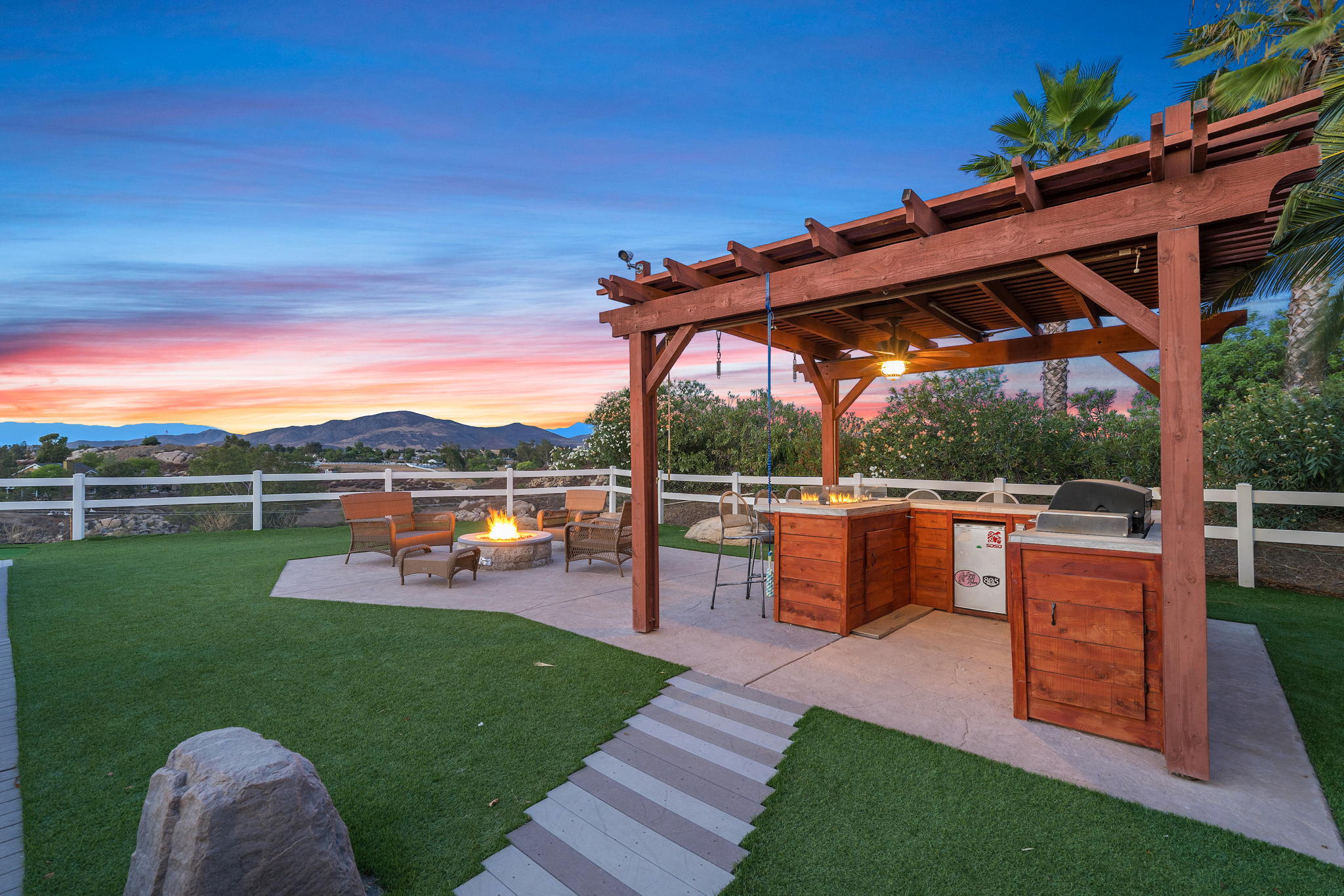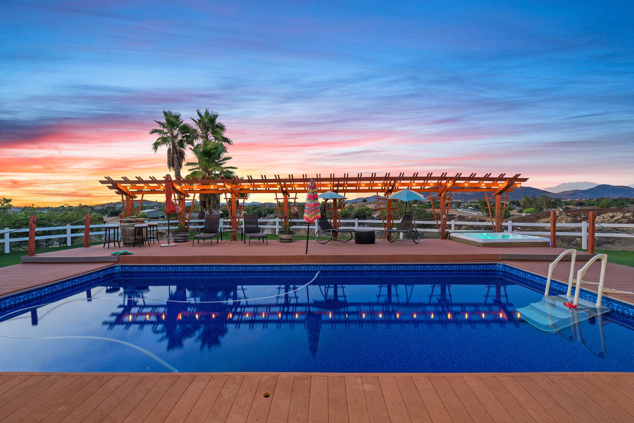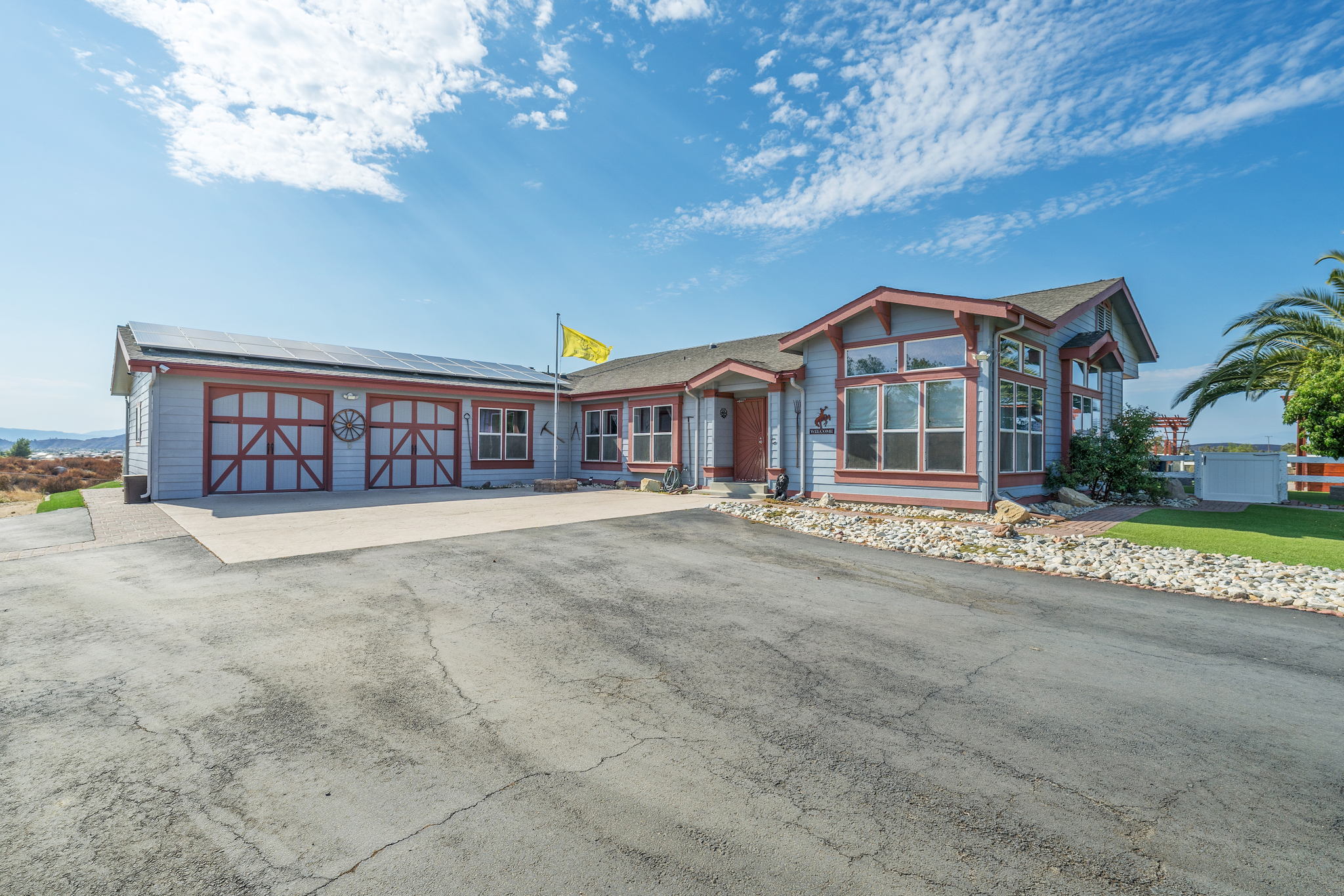 The spectacular panoramic view home you’ve been waiting for-this is it! Imagine looking at snow capped mountains in the winter while taking in the breathtaking spectacular panoramic VIEWS! This recently renovated SINGLE STORY beauty is everything an owner seeking substantial land with gated entry could dream of! From point of living room entry, you’ll fall in love with the newer wide vinyl plank flooring which opens up to the sizable great room which then flows into the upgraded kitchen featuring large center island, double ovens, farmhouse sink, custom walk-in pantry with counters and views of those amazing mountains. The owner’s retreat is generously sized and has a built-in dresser, walk-in closet, corner soaking tub, separate step-in shower with 2 heads and dual vanity sinks. All baths have been renovated over the past couple years. Fresh interior paint in most rooms, too. The great room with custom built-ins and an relaxing fireplace creates that perfect ambiance for enjoying our chilly Temecula Valley evenings. Imagine having your own pool, Trex decking, above ground spa, kennels, artificial turf, airplane hangar (with 30X50′ doors opening on each end) along with an RV garage complete with full hook ups. The “extra” are endless including Bocce ball court, firepit, built-in barbeque and there’s even a fruit tree orchard. This home also has a whole house fan and 30 solar panels under a Power Purchase Agreement. Imagine no sewer bill, no water bill and reduced electricity bills. This home is move in ready and ready for it’s right fit buyer who needs plenty of space to expand, play and entertain. Conveniently located near award-winning Temecula schools, interstates and popular wineries. Call to schedule to your tour today!