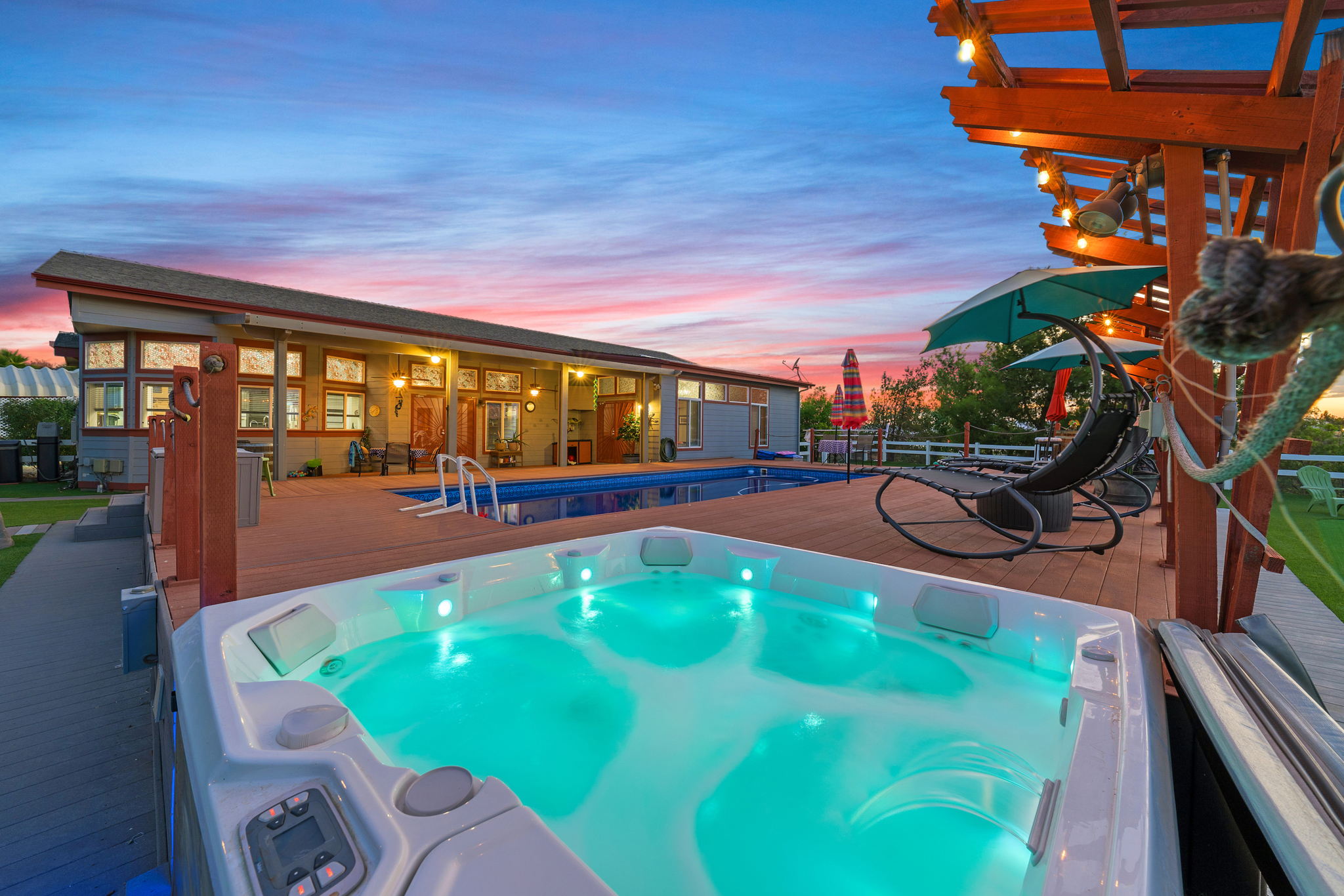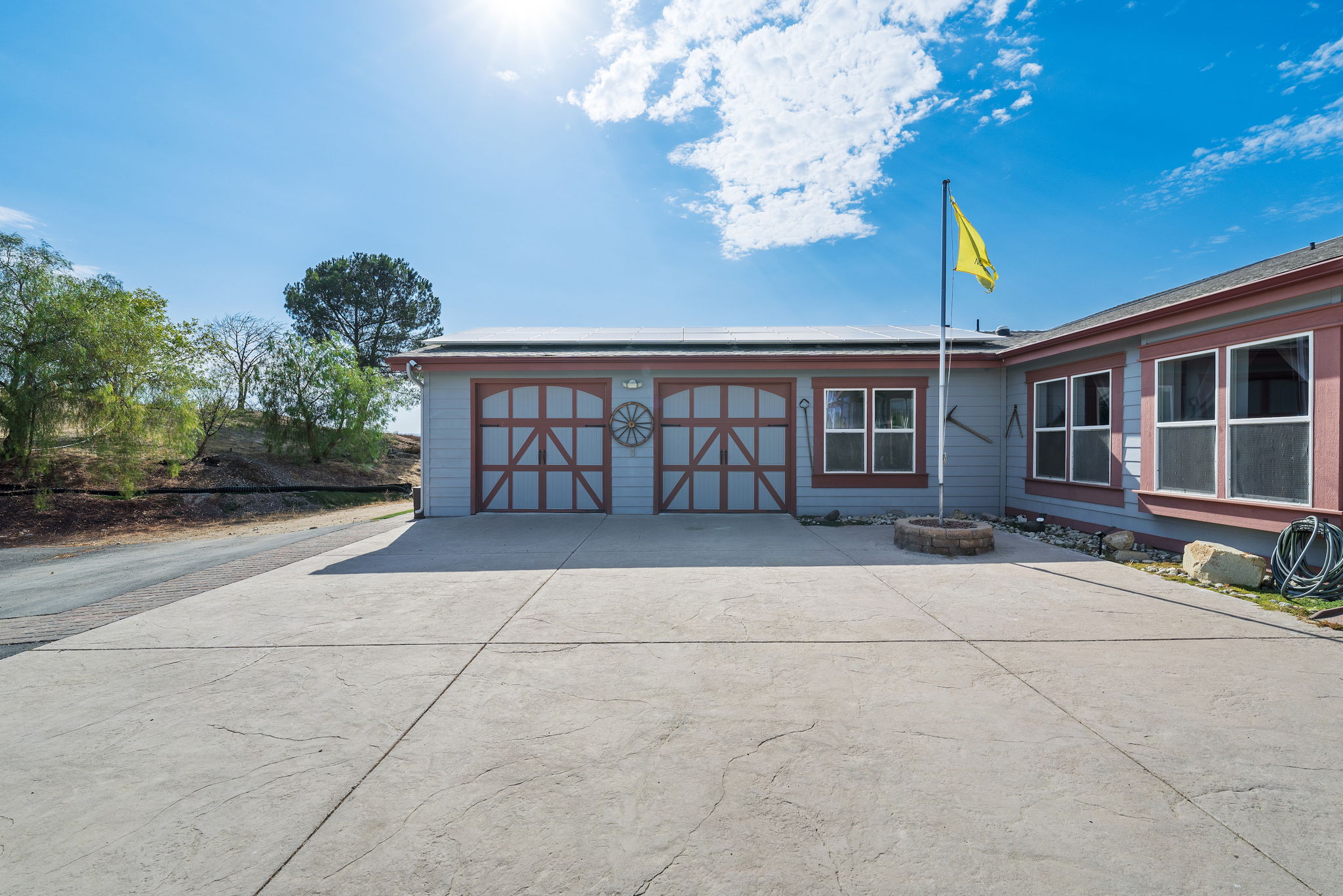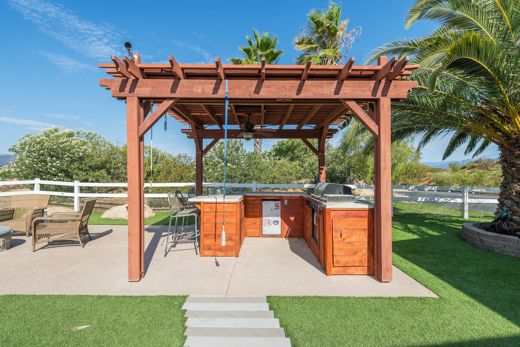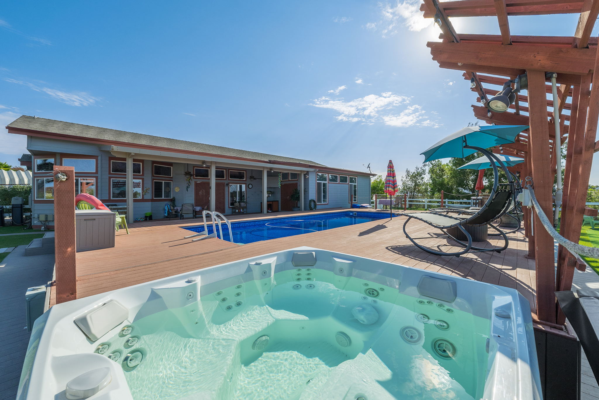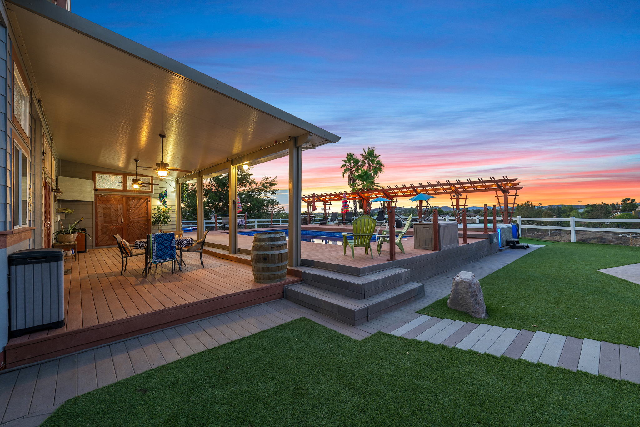 The spectacular panoramic view home you’ve been waiting for-this is it! Imagine looking at snow capped mountains in the winter while taking in the breathtaking spectacular panoramic VIEWS! This recently renovated SINGLE STORY beauty is everything an owner seeking substantial land with gated entry could dream of! From point of living room entry, you’ll fall in love with the newer wide vinyl plank flooring which opens up to the sizable great room which then flows into the upgraded kitchen featuring large center island, double ovens, farmhouse sink, custom walk-in pantry with counters and views of those amazing mountains. The owner’s retreat is generously sized and has a built-in dresser, walk-in closet, corner soaking tub, separate step-in shower with 2 heads and dual vanity sinks. All baths have been renovated over the past couple years. Fresh interior paint in most rooms, too. The great room with custom built-ins and an relaxing fireplace creates that perfect ambiance for enjoying our chilly Temecula Valley evenings. Imagine having your own pool, Trex decking, above ground spa, kennels, artificial turf, airplane hangar (with 30X50′ doors opening on each end) along with an RV garage complete with full hook ups. The “extra” are endless including Bocce ball court, firepit, built-in barbeque and there’s even a fruit tree orchard. This home also has a whole house fan and 30 solar panels under a Power Purchase Agreement. Imagine no sewer bill, no water bill and reduced electricity bills. This home is move in ready and ready for it’s right fit buyer who needs plenty of space to expand, play and entertain. Conveniently located near award-winning Temecula schools, interstates and popular wineries. Call to schedule to your tour today!