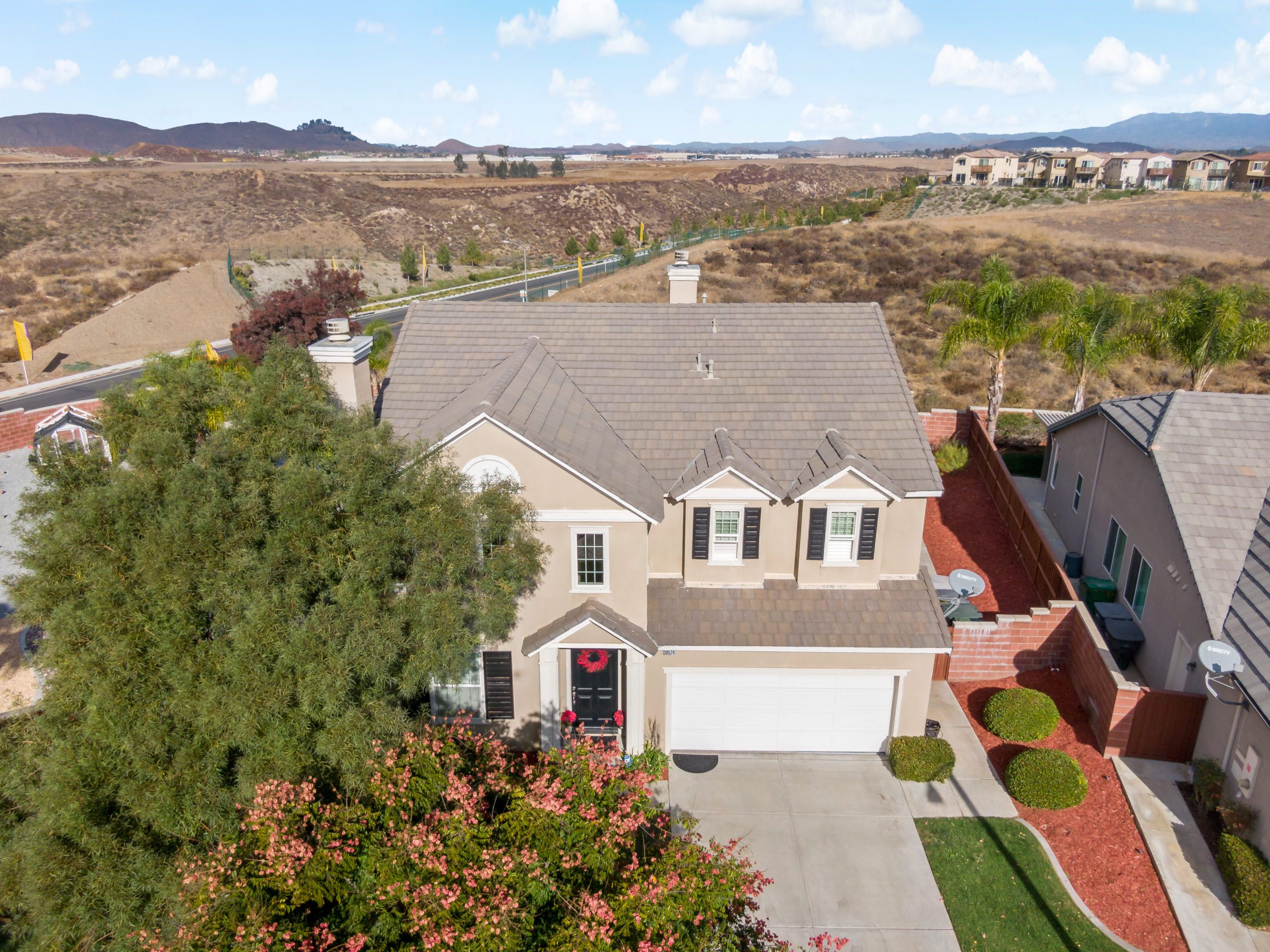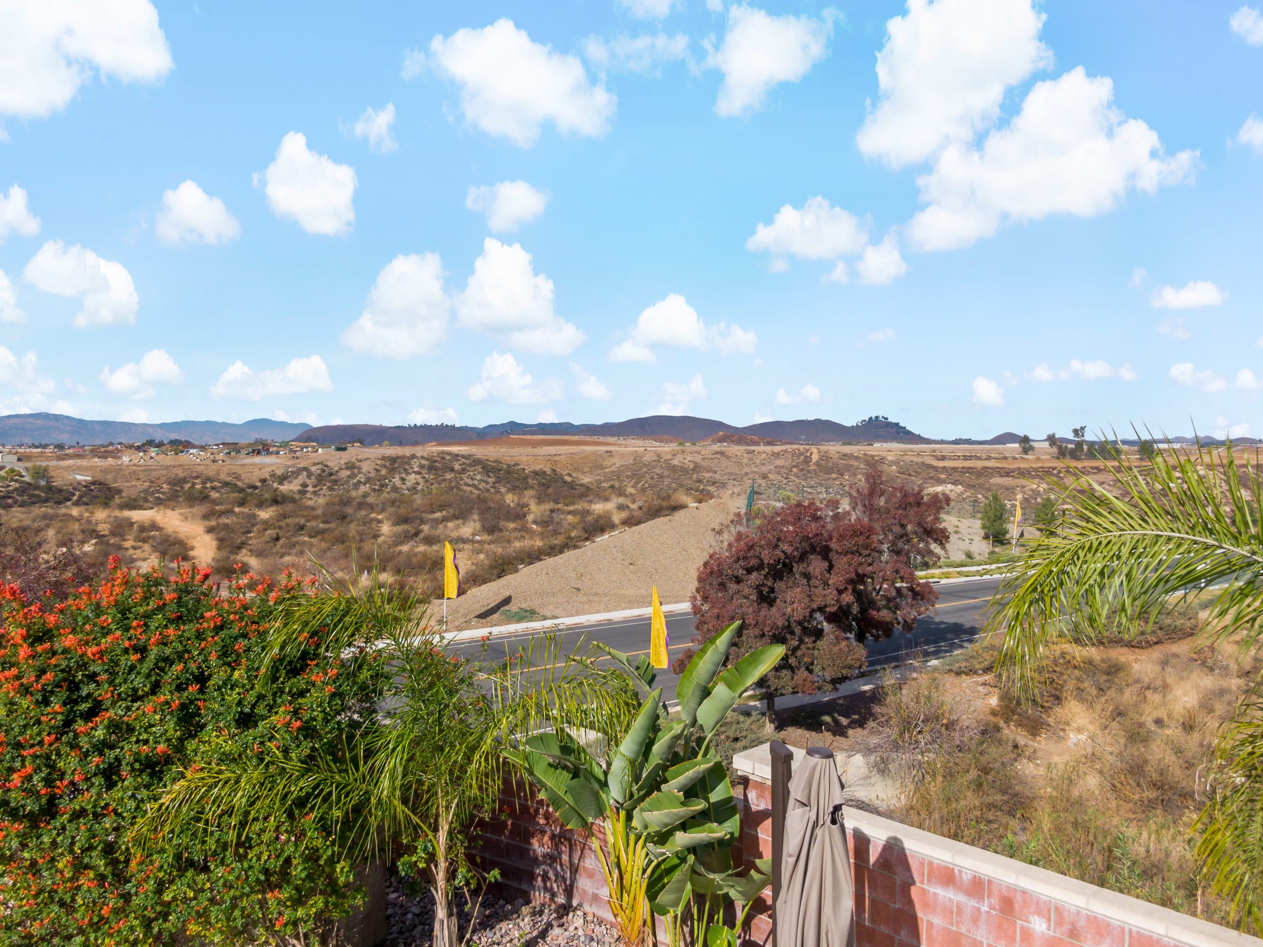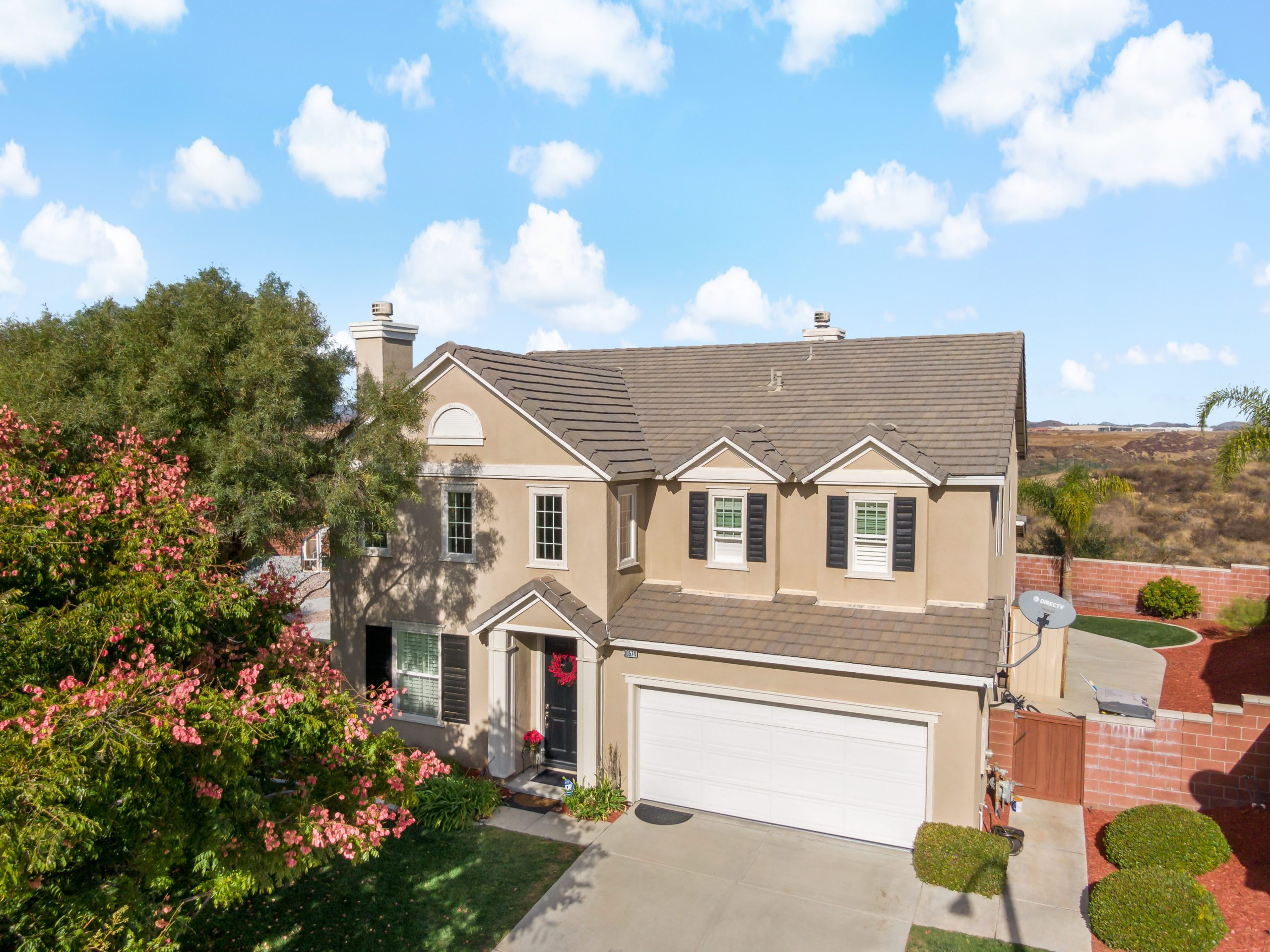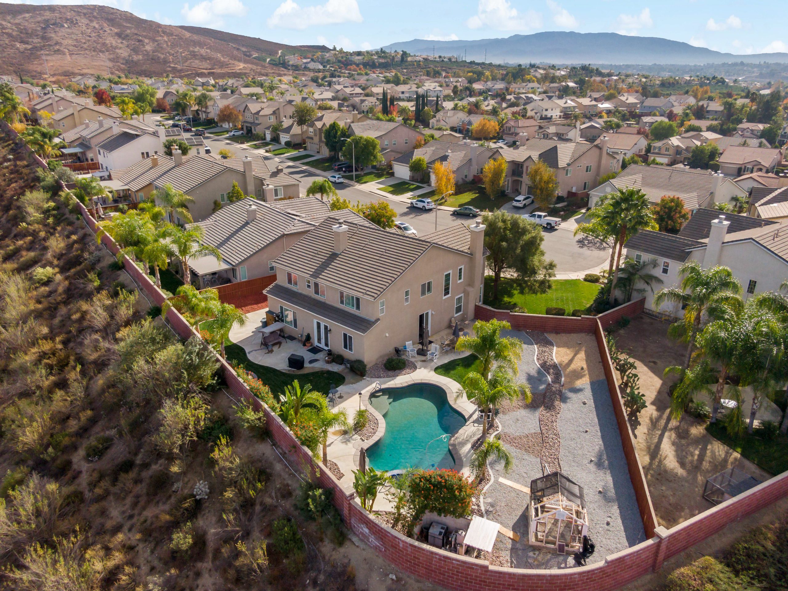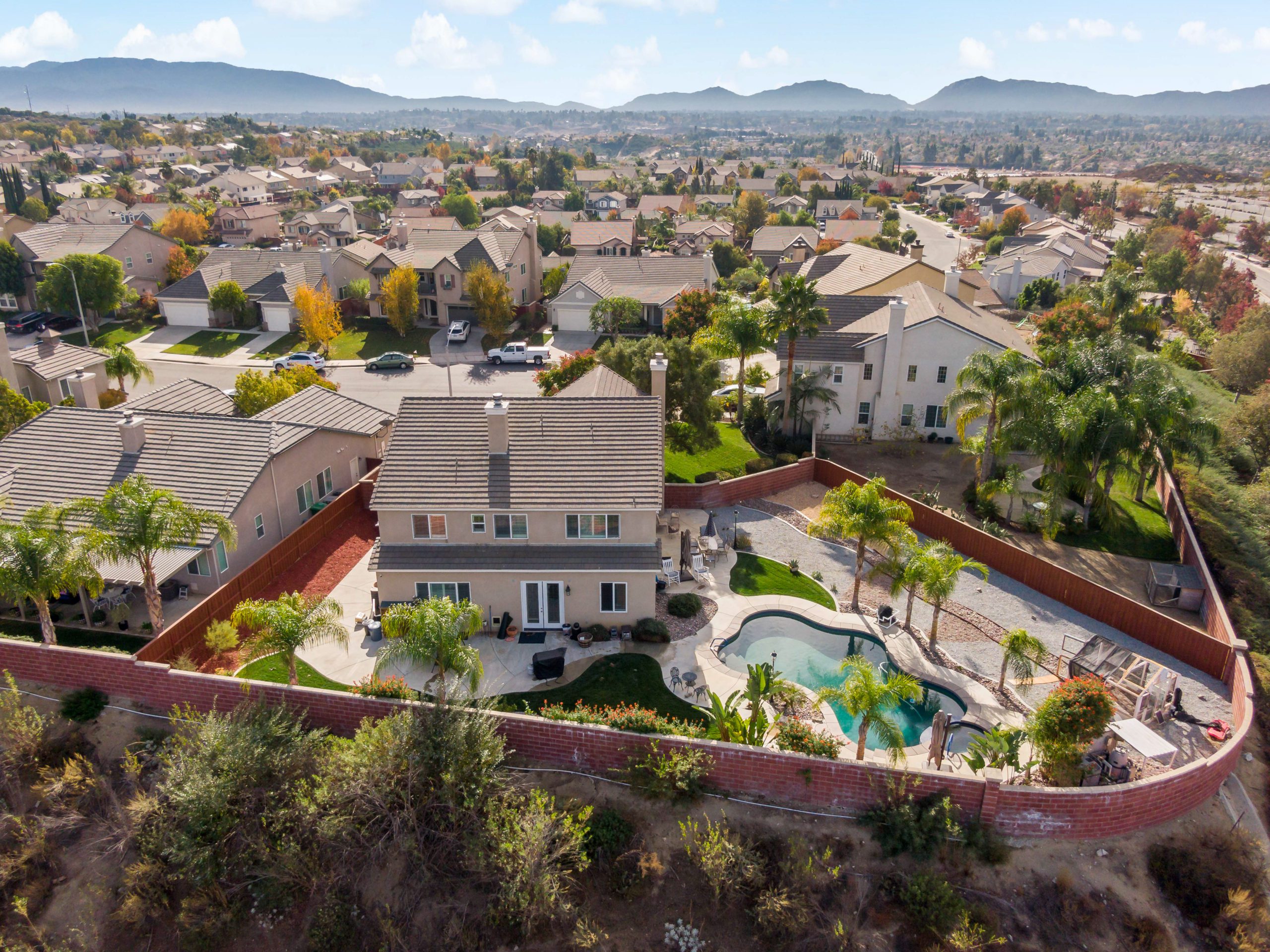 Spectacular VIEW and POOL home in the highly desirable Central Park community. Cul-de-sac location with this Pulte-built beauty featuring plenty of upgrades including granite counters, Plantation shutters, two fireplaces, tile flooring, new carpet and alarm system. Tasteful and neutral colors throughout. The dramatically tall ceilings upon entry let in plenty of natural light which flows from living room to dining room and on into the entertainer’s delight of a kitchen/family room/great room. The kitchen features a center island with additional sink, butler’s counter and stainless steel appliances. Downstairs bedroom and full bath. The master suite includes a jetted tub, separate walk-in shower, dual sinks and closet built-ins. Three additional bedrooms upstairs in addition to the inviting loft ideal for crafts, computer stations, games or home theatre. The backyard is one of the larger lots in Central Park with lots of privacy, no rear neighbors and a nearly panoramic view. Fruit trees, too! The garage has built in cabinets and epoxy coated flooring. Conveniently located to Temecula schools, interstates, local wineries and shopping. Plenty of community extras including pool, sport court, tot lots, tennis, clubhouse and hiking trails. Low taxes/low HOA. Call to tour today!Ā