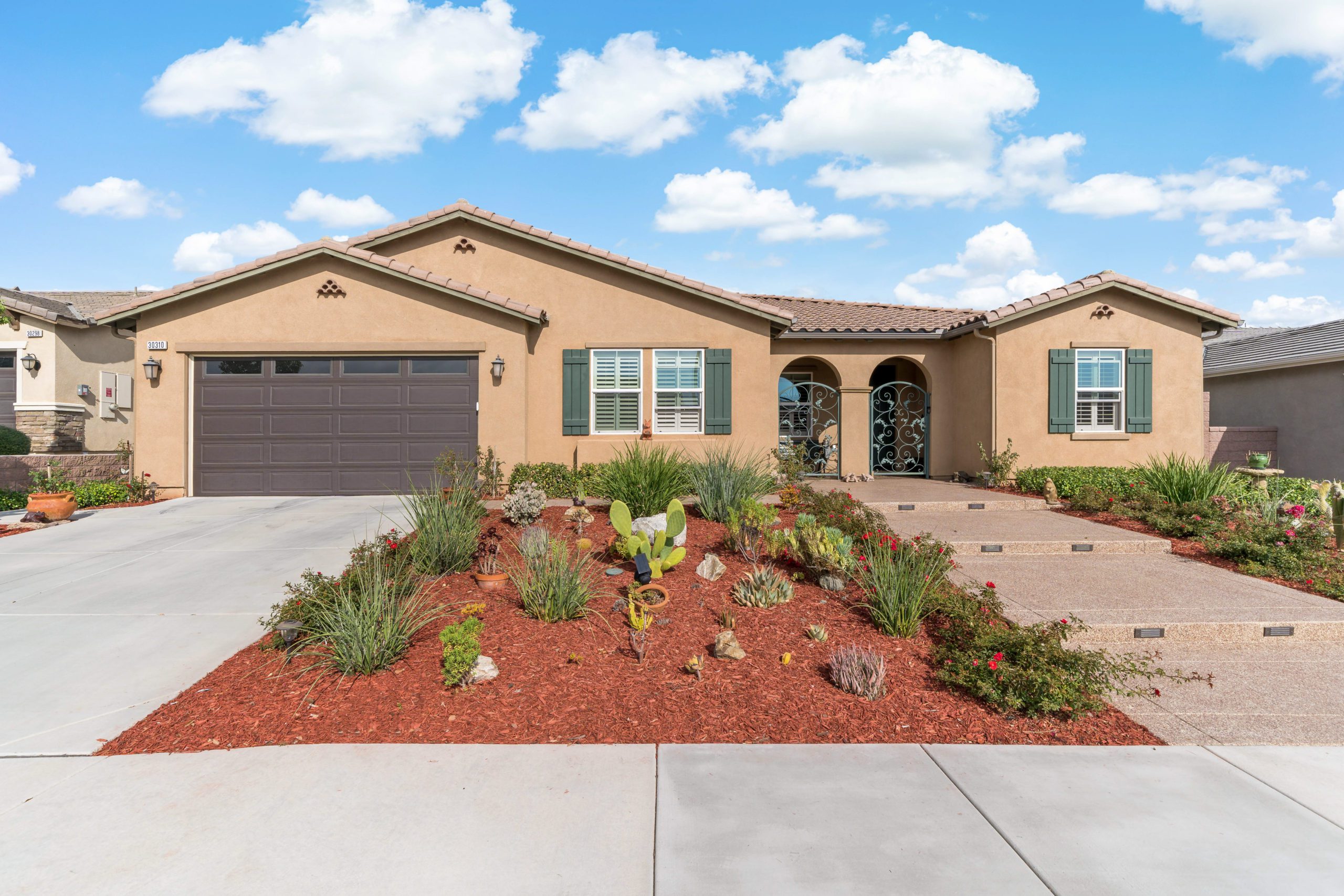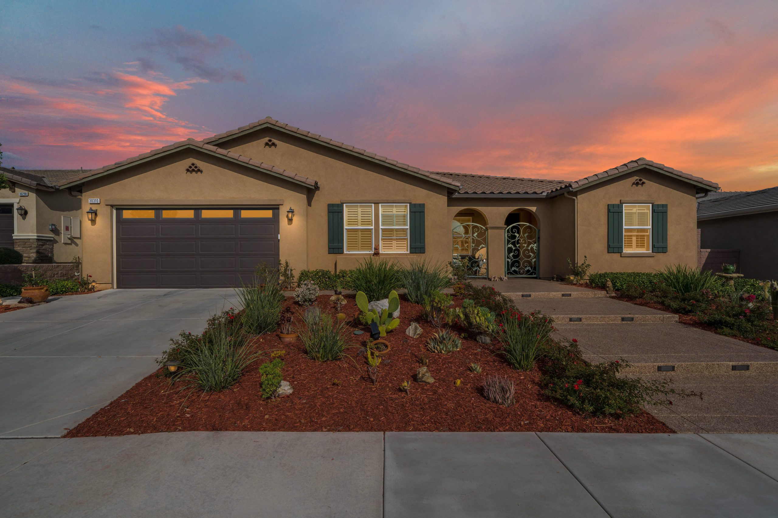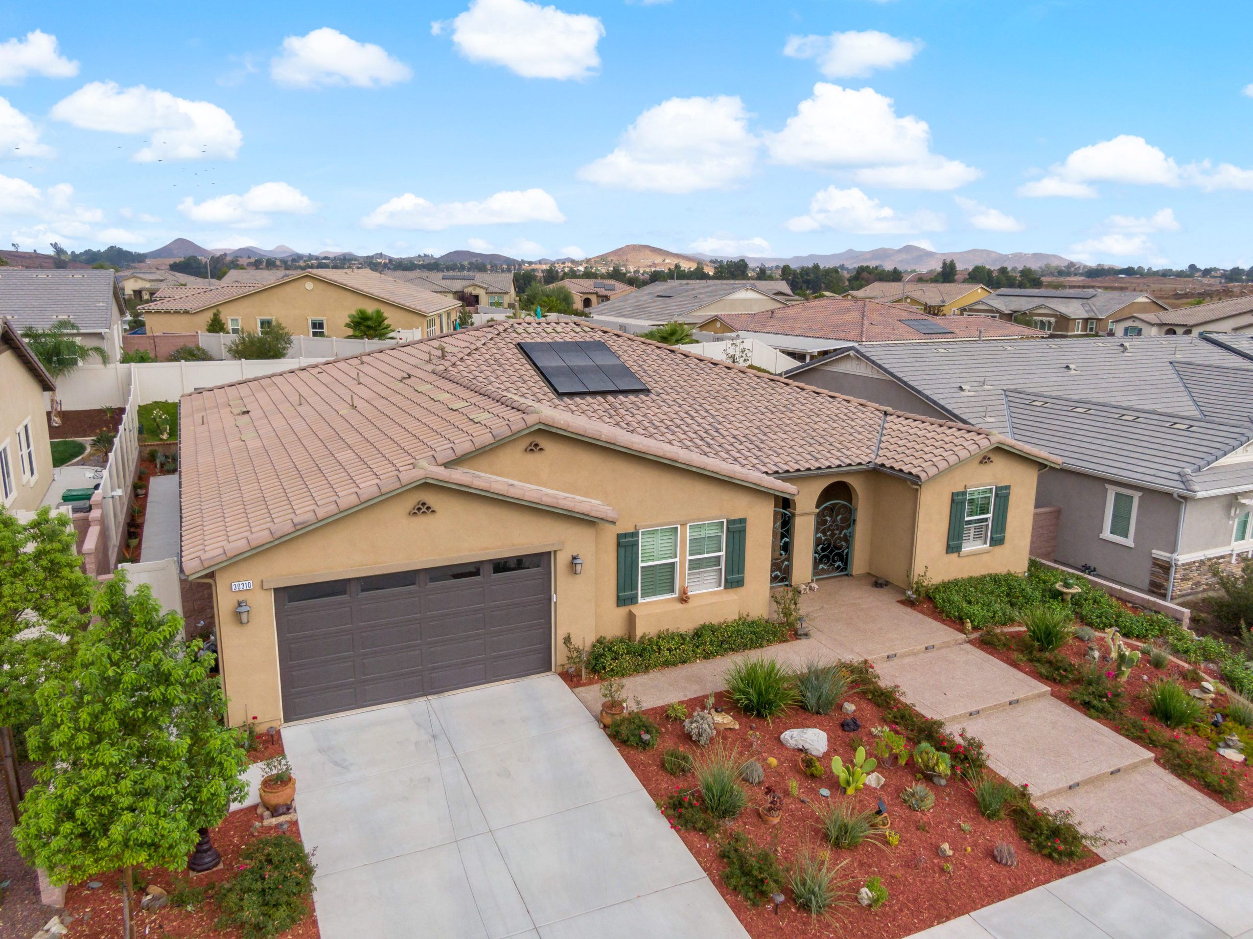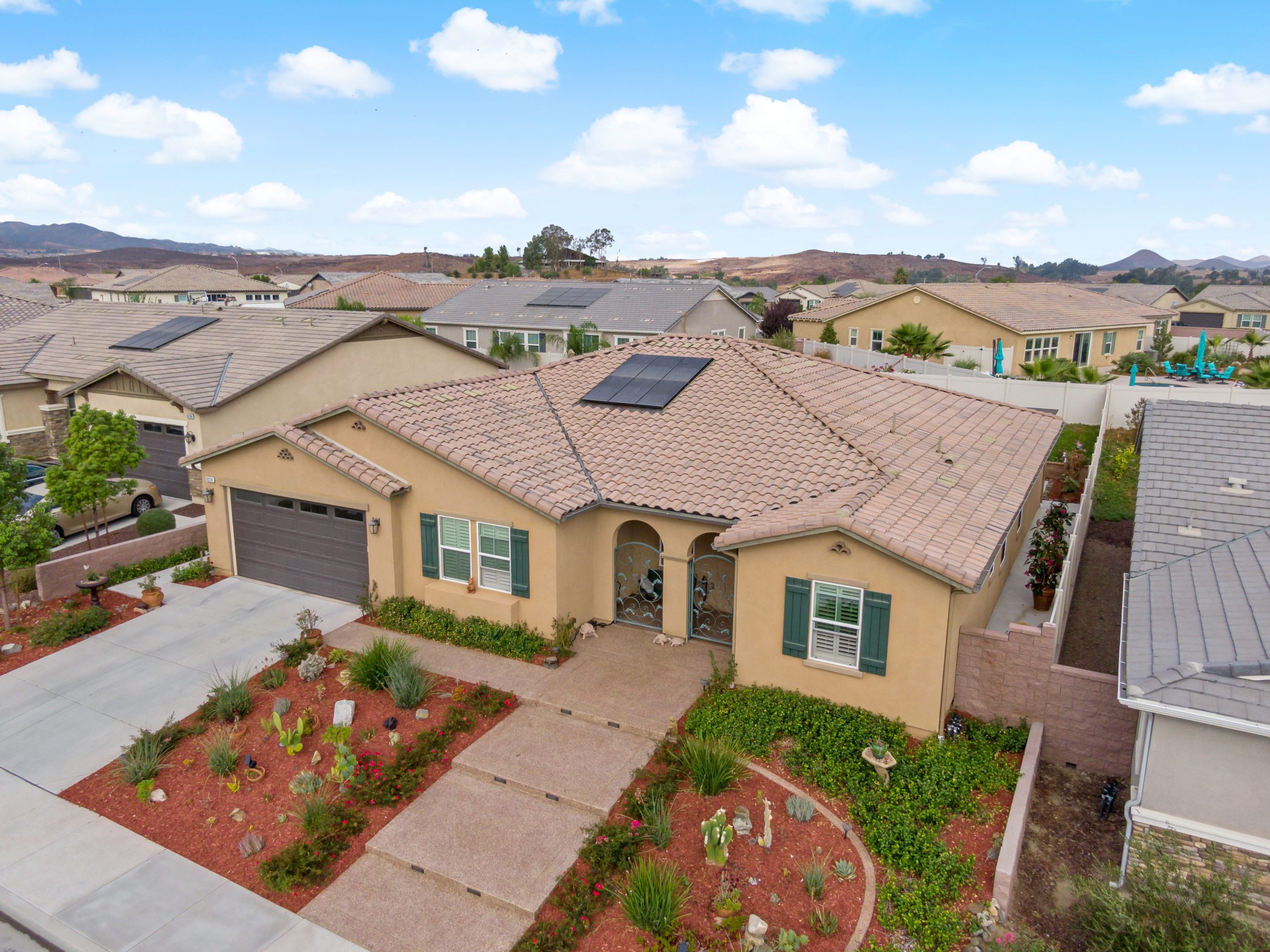 Stunning and immaculate single story home in the popular community of Mahogany Hills. Marvelous curb appeal with lighted custom walkway and wrought iron gated double archway entry. This lovely gem warmly and impressively greets even the pickiest of buyers. Open concept floor plan with tile plank flooring, upgraded baseboards and crown moulding in many rooms. The warm neutral tones, upgraded light fixtures and ceiling fans create an exceptionally warm and peaceful ambiance. The entertainer’s dream kitchen has a sizeable center island, eat-in kitchen, white cabinetry with handles/pulls, butler’s pantry, granite counters, stainless steel appliances and walk-in pantry. Separate dining room. The generously sized family room includes a fireplace ideal for enjoying our chilly winter evenings. The master suite has it’s own retreat area perfect for morning coffee and evening movies. The master bath has an upgraded soaking tub, walk-in shower, dual vanity sinks, gorgeous glass tile design with bronze fixtures and walk-in closet. The guest suite at the front of the home allows guests their own bathroom and complete privacy. The backyard allows for plenty of relaxation. Alumawood patio cover along with low maintenance landscape. There’s even a mountain view from the side and front. 3-car tandem garage with epoxy coated flooring. 6 paid for solar panels. Close proximity to community dog park, walking trails and top rated Lisa J Mails elementary school. Call to tour today!