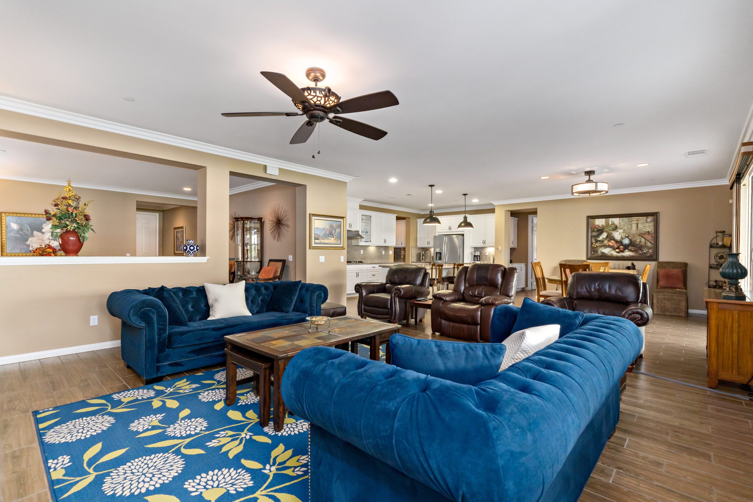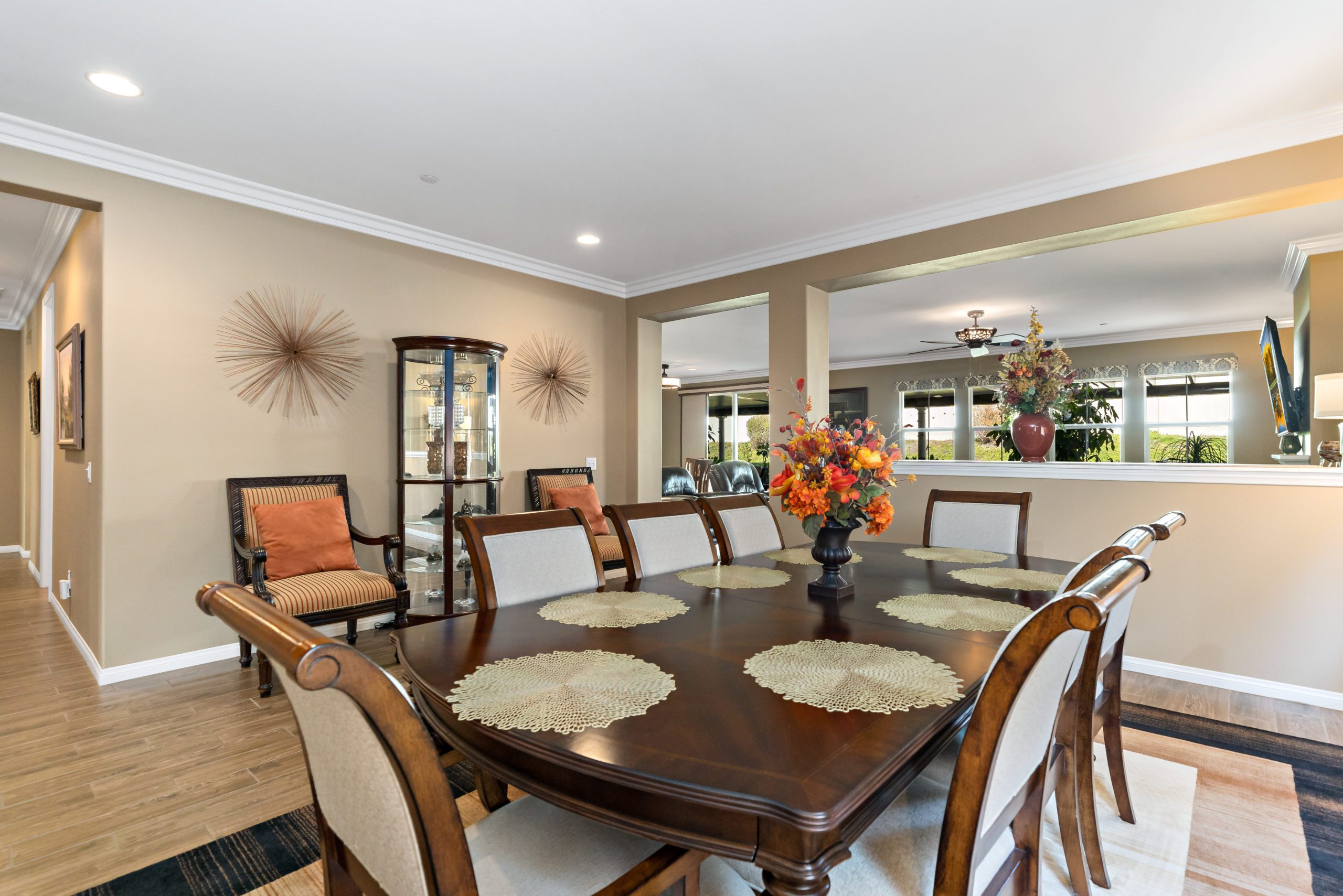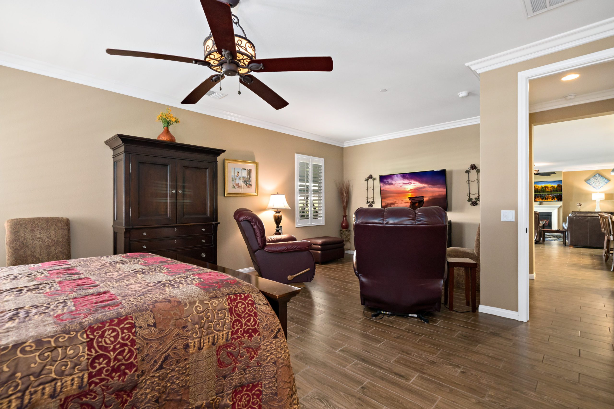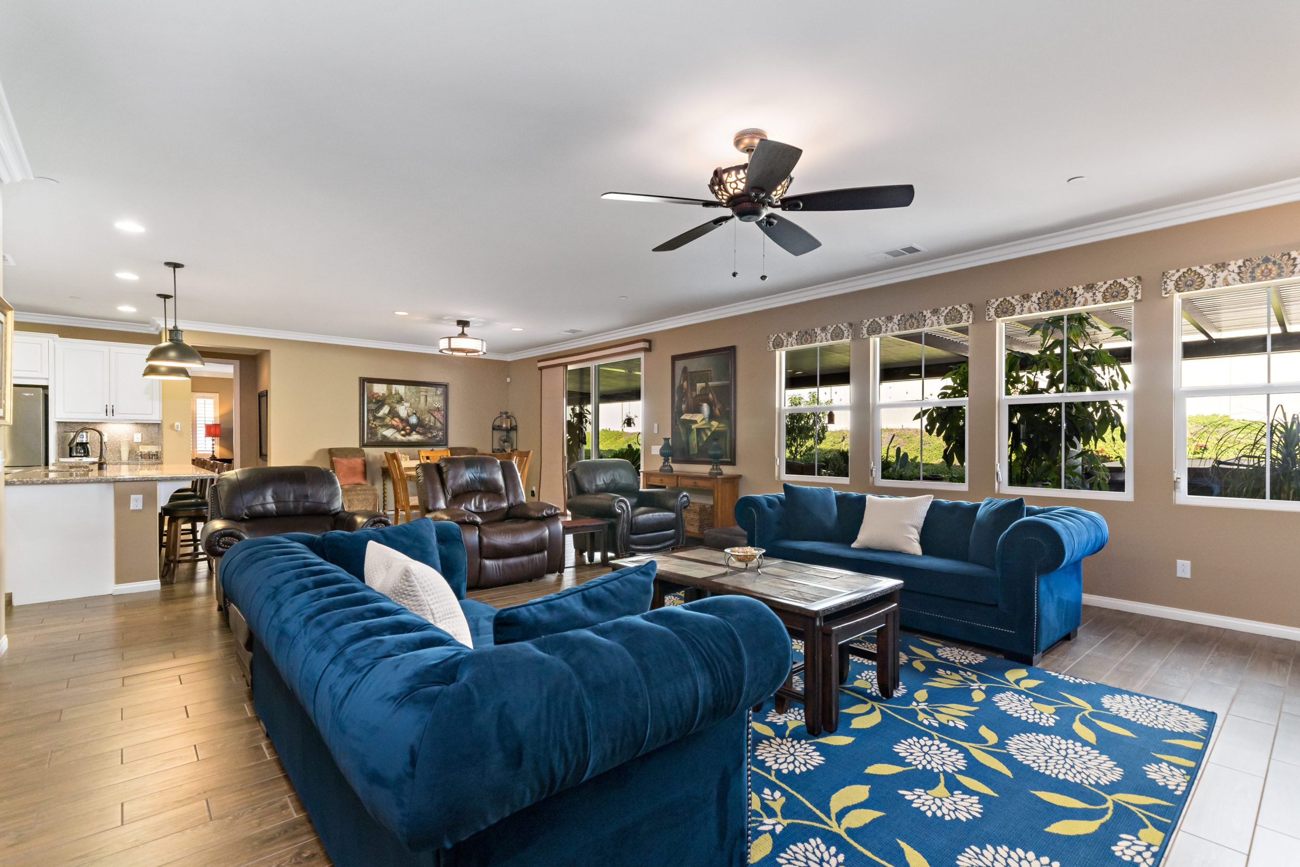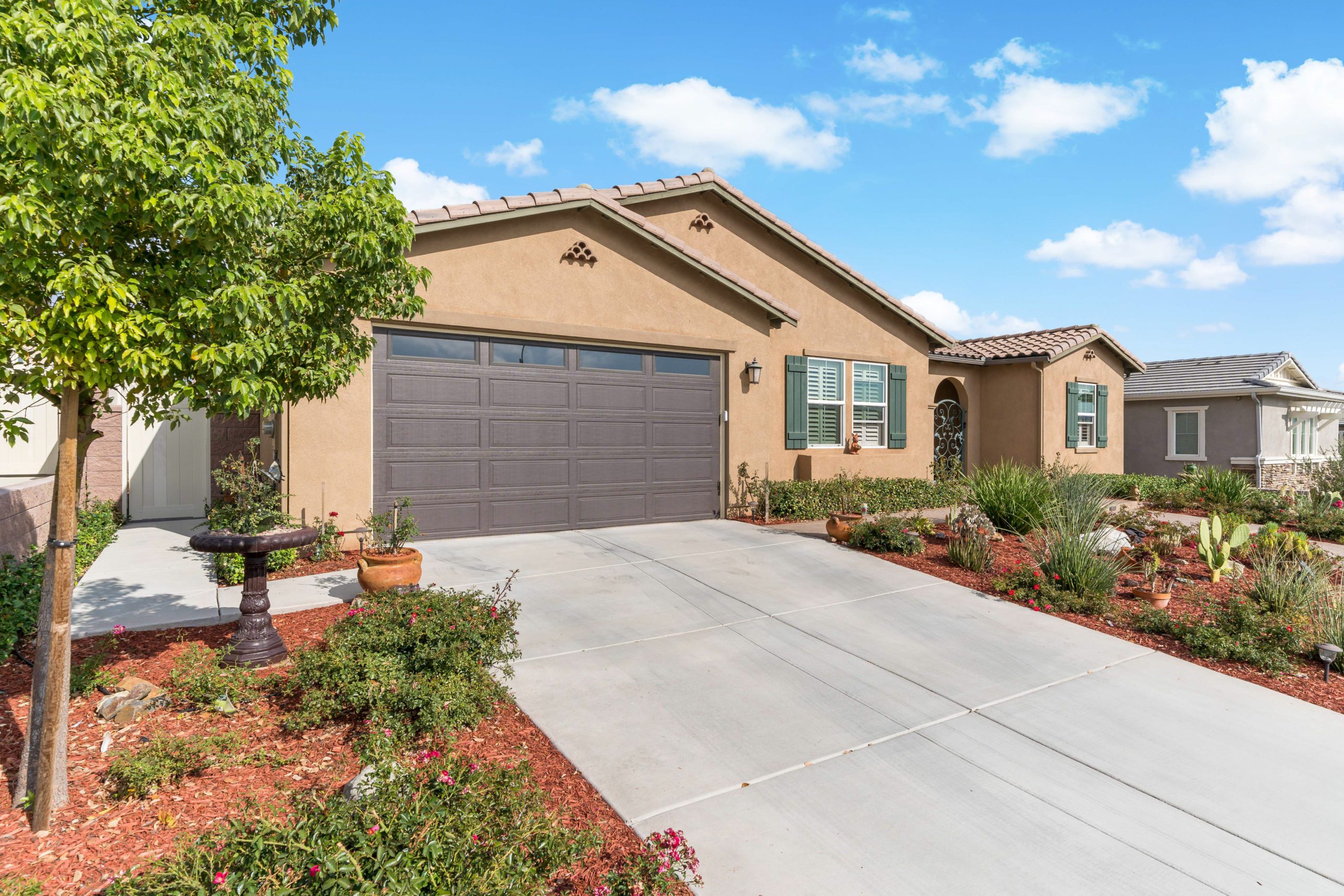 Stunning and immaculate single story home in the popular community of Mahogany Hills. Marvelous curb appeal with lighted custom walkway and wrought iron gated double archway entry. This lovely gem warmly and impressively greets even the pickiest of buyers. Open concept floor plan with tile plank flooring, upgraded baseboards and crown moulding in many rooms. The warm neutral tones, upgraded light fixtures and ceiling fans create an exceptionally warm and peaceful ambiance. The entertainer’s dream kitchen has a sizeable center island, eat-in kitchen, white cabinetry with handles/pulls, butler’s pantry, granite counters, stainless steel appliances and walk-in pantry. Separate dining room. The generously sized family room includes a fireplace ideal for enjoying our chilly winter evenings. The master suite has it’s own retreat area perfect for morning coffee and evening movies. The master bath has an upgraded soaking tub, walk-in shower, dual vanity sinks, gorgeous glass tile design with bronze fixtures and walk-in closet. The guest suite at the front of the home allows guests their own bathroom and complete privacy. The backyard allows for plenty of relaxation. Alumawood patio cover along with low maintenance landscape. There’s even a mountain view from the side and front. 3-car tandem garage with epoxy coated flooring. 6 paid for solar panels. Close proximity to community dog park, walking trails and top rated Lisa J Mails elementary school. Call to tour today!
