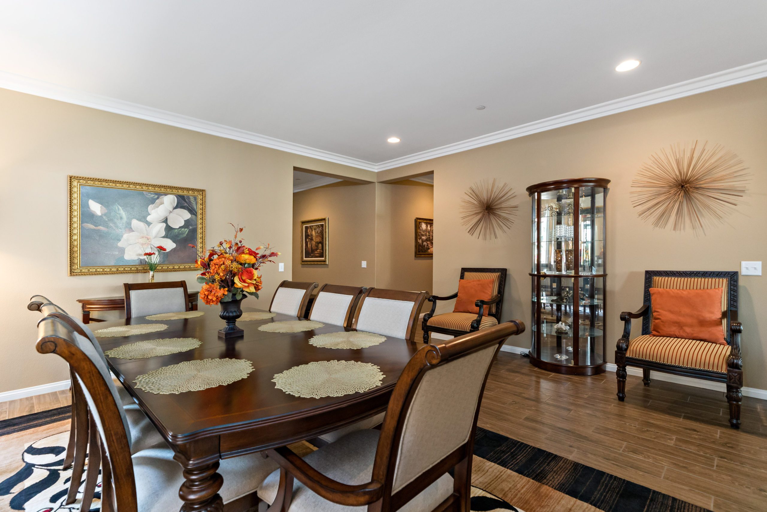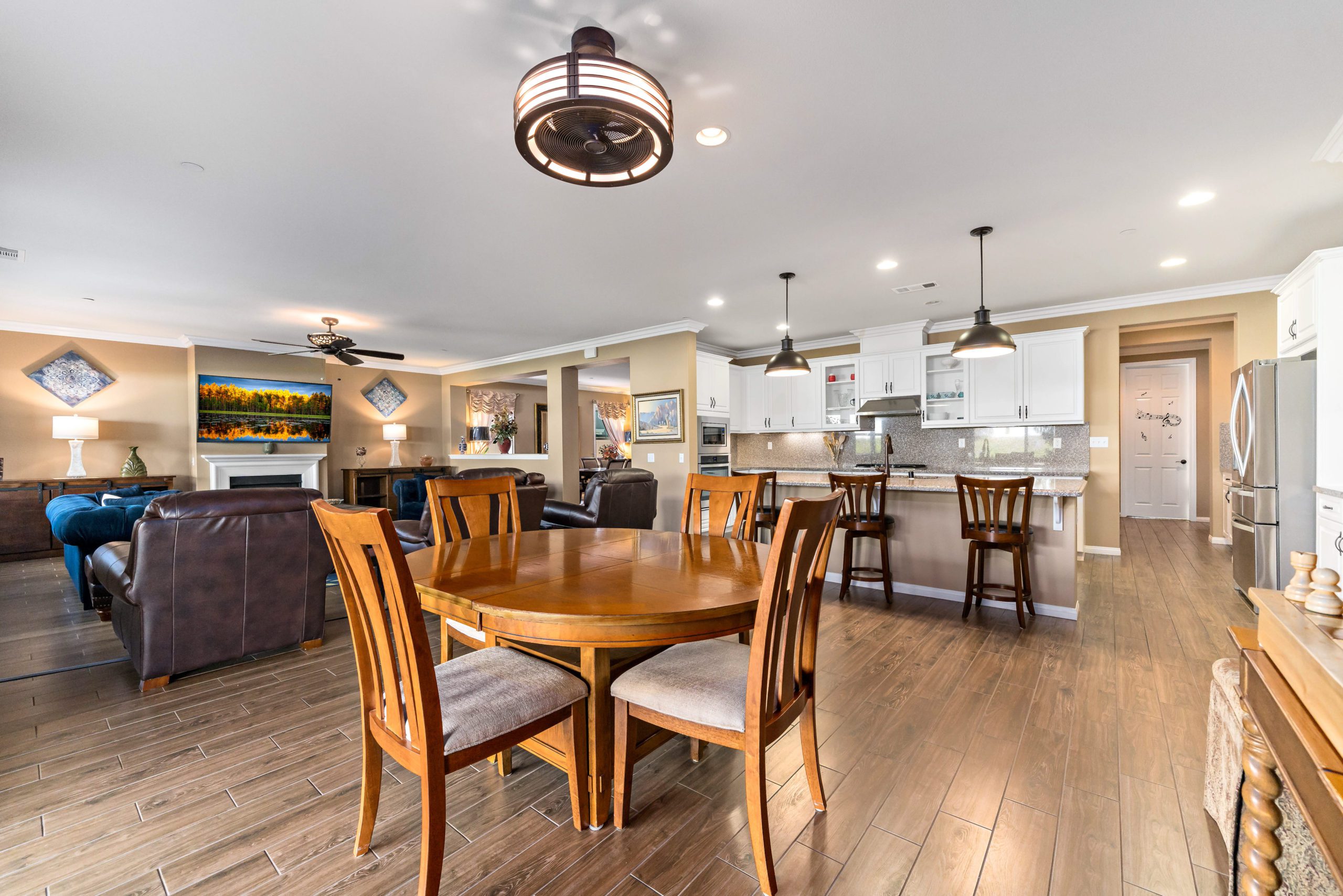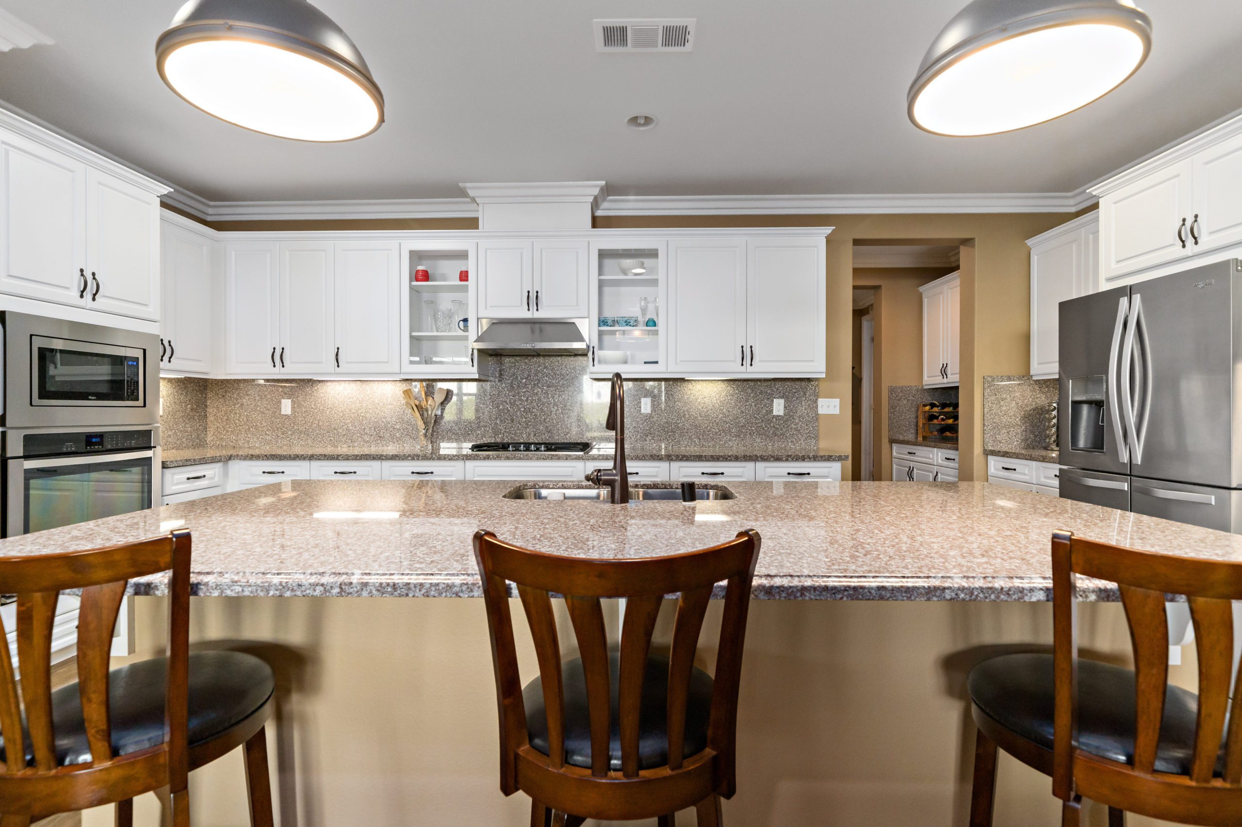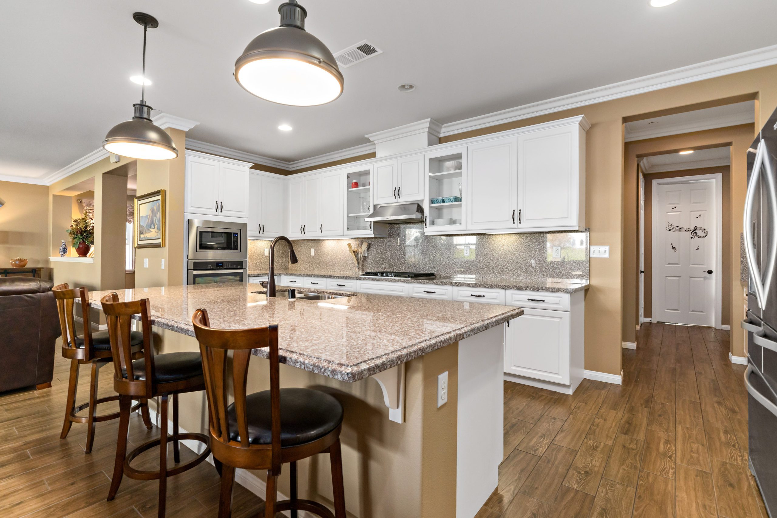 Stunning and immaculate single story home in the popular community of Mahogany Hills. Marvelous curb appeal with lighted custom walkway and wrought iron gated double archway entry. This lovely gem warmly and impressively greets even the pickiest of buyers. Open concept floor plan with tile plank flooring, upgraded baseboards and crown moulding in many rooms. The warm neutral tones, upgraded light fixtures and ceiling fans create an exceptionally warm and peaceful ambiance. The entertainer’s dream kitchen has a sizeable center island, eat-in kitchen, white cabinetry with handles/pulls, butler’s pantry, granite counters, stainless steel appliances and walk-in pantry.