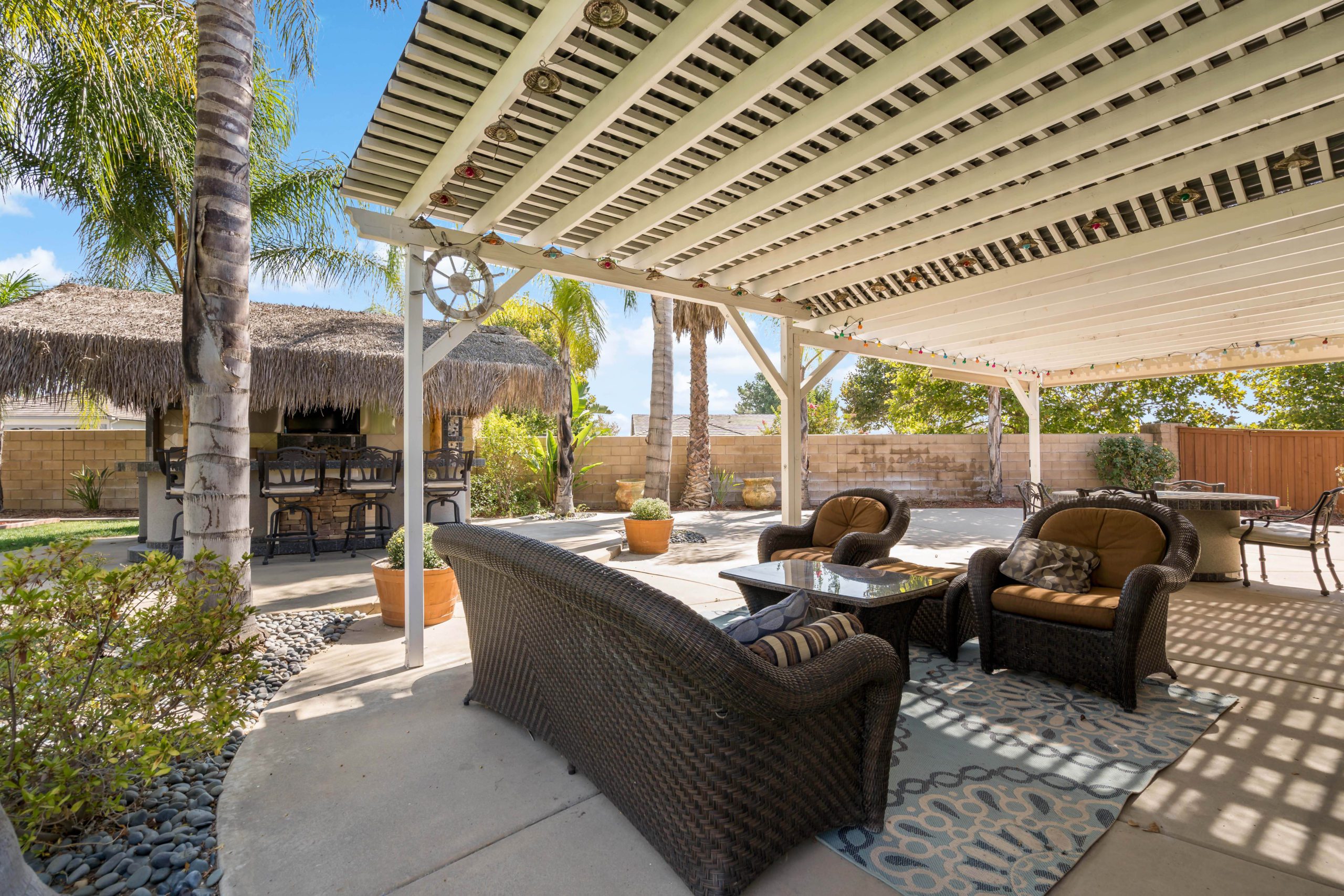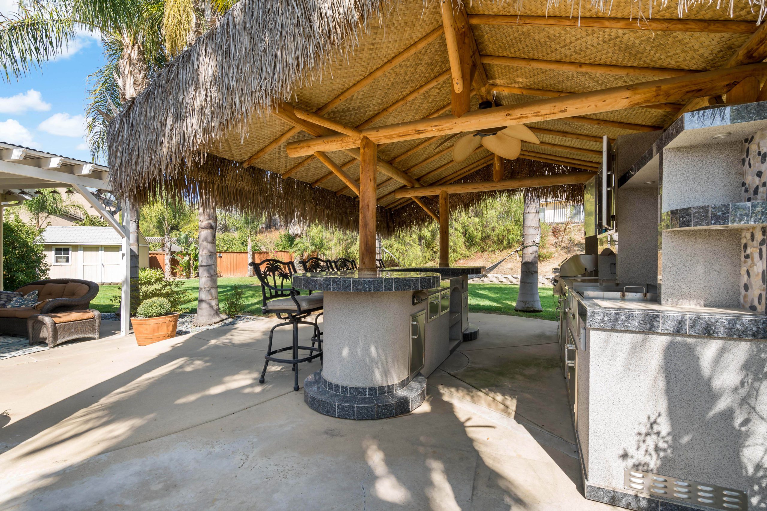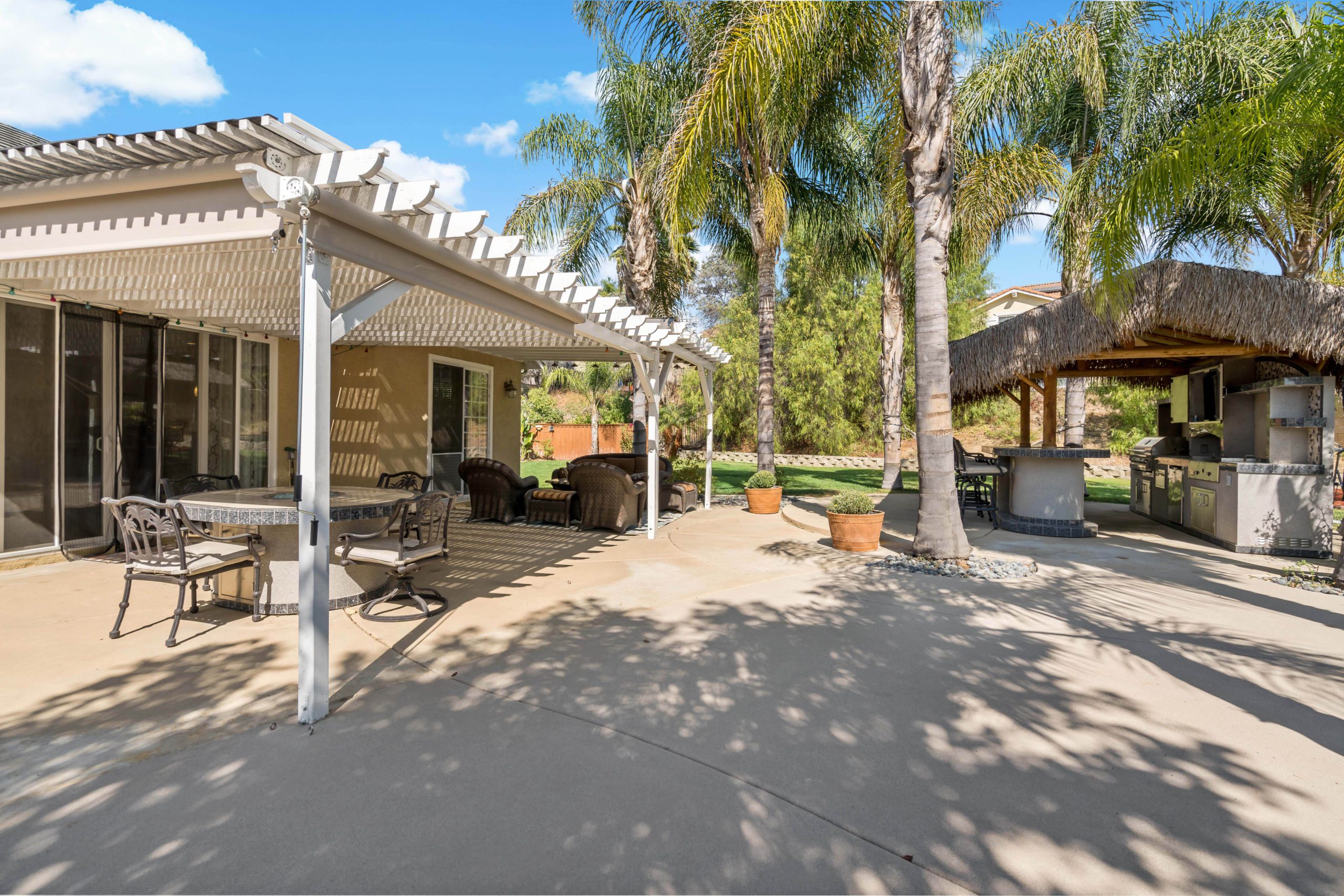 Truly a rare and remarkable gem in this home. Situated at the end of a cul-de-sac this Temecula entertainer’s paradise is ready to go! Two downstairs bedrooms including a generously sized master suite complete with French doors that open up to the backyard treasure. There is also a bonus room (non-permitted) downstairs that was previously the 3rd car garage. Upstairs are two more bedrooms with plenty of room to spread out. The kitchen has been completely remodeled and includes granite counters, glass tile backsplash, white cabinets, sizeable center island, walk-in pantry and stainless steel appliances. The open concept family room comes complete with built-ins and inviting fireplace. The double sliding glass doors from the great room further enhance the smooth flow of this layout which lead to the amazing backyard complete with Palapa, built in barbeque, flat grill, refrigerator and TV. There is even a relaxing firepit and also darling outdoor storage shed which matches the house. This is one of the larger lots in this popular community that can easily accommodate a large pool (has already been pre-plumbed). Award winning Temecula schools. Close and convenient to shopping, dining and local wineries. Call to tour today! Temecula entertainer’s paradise