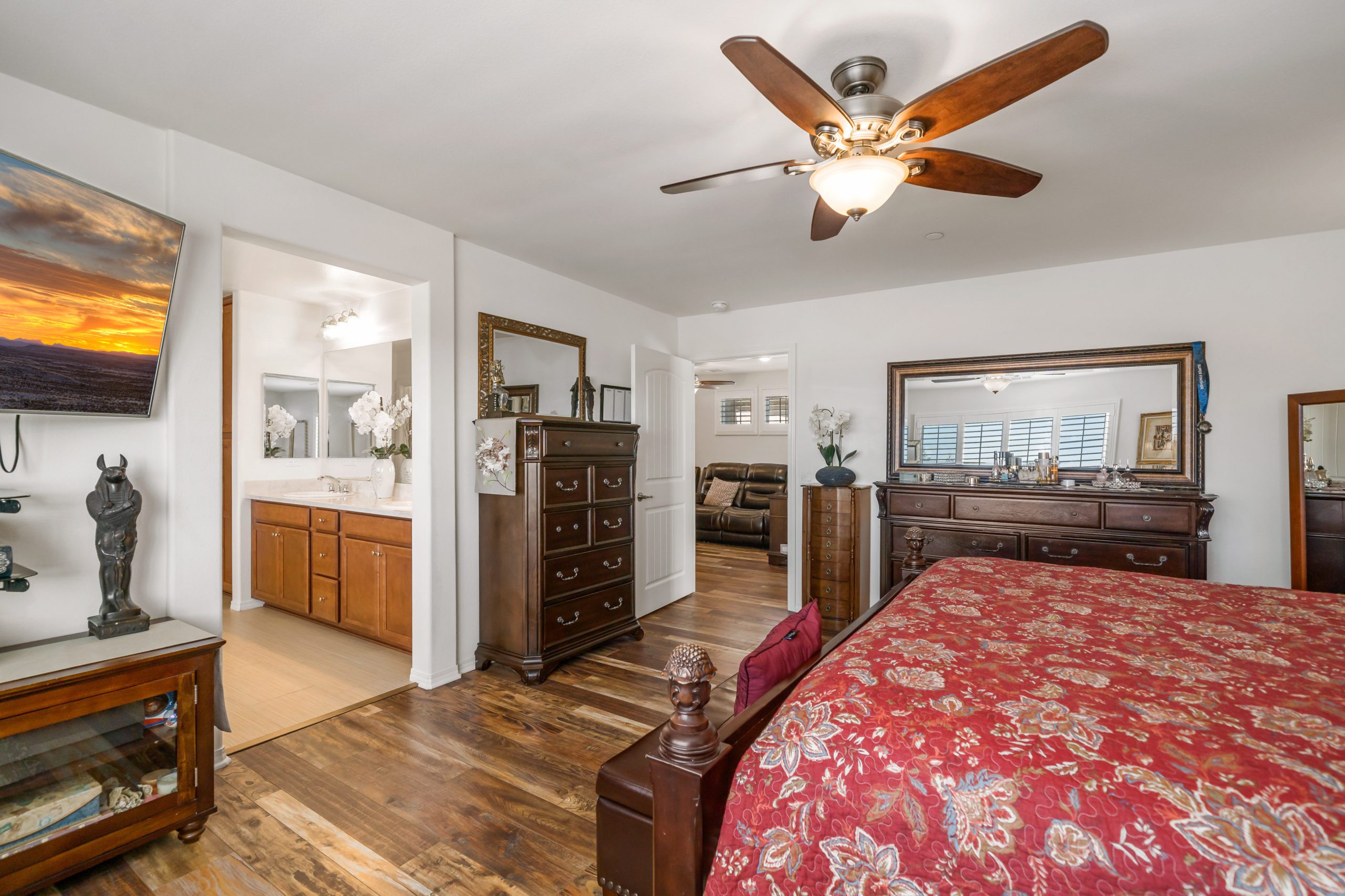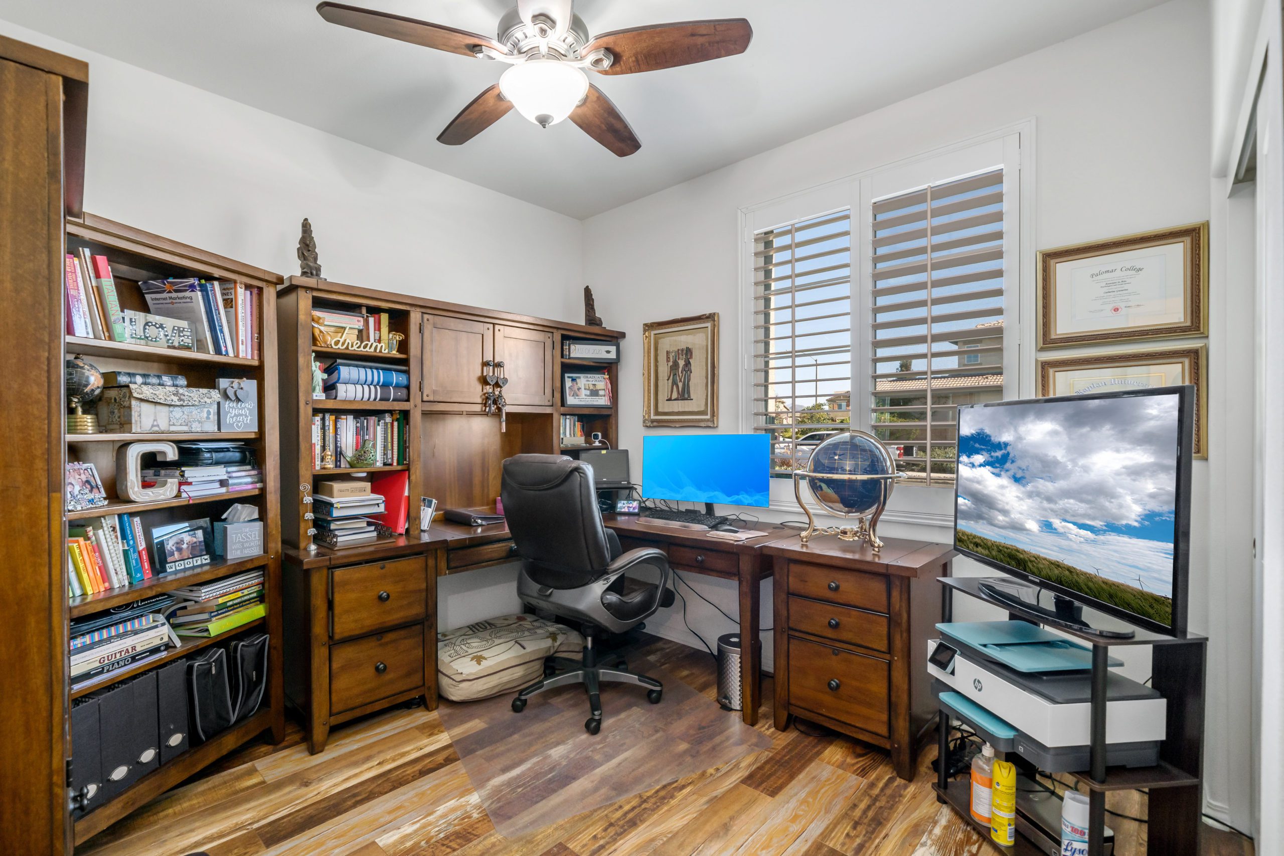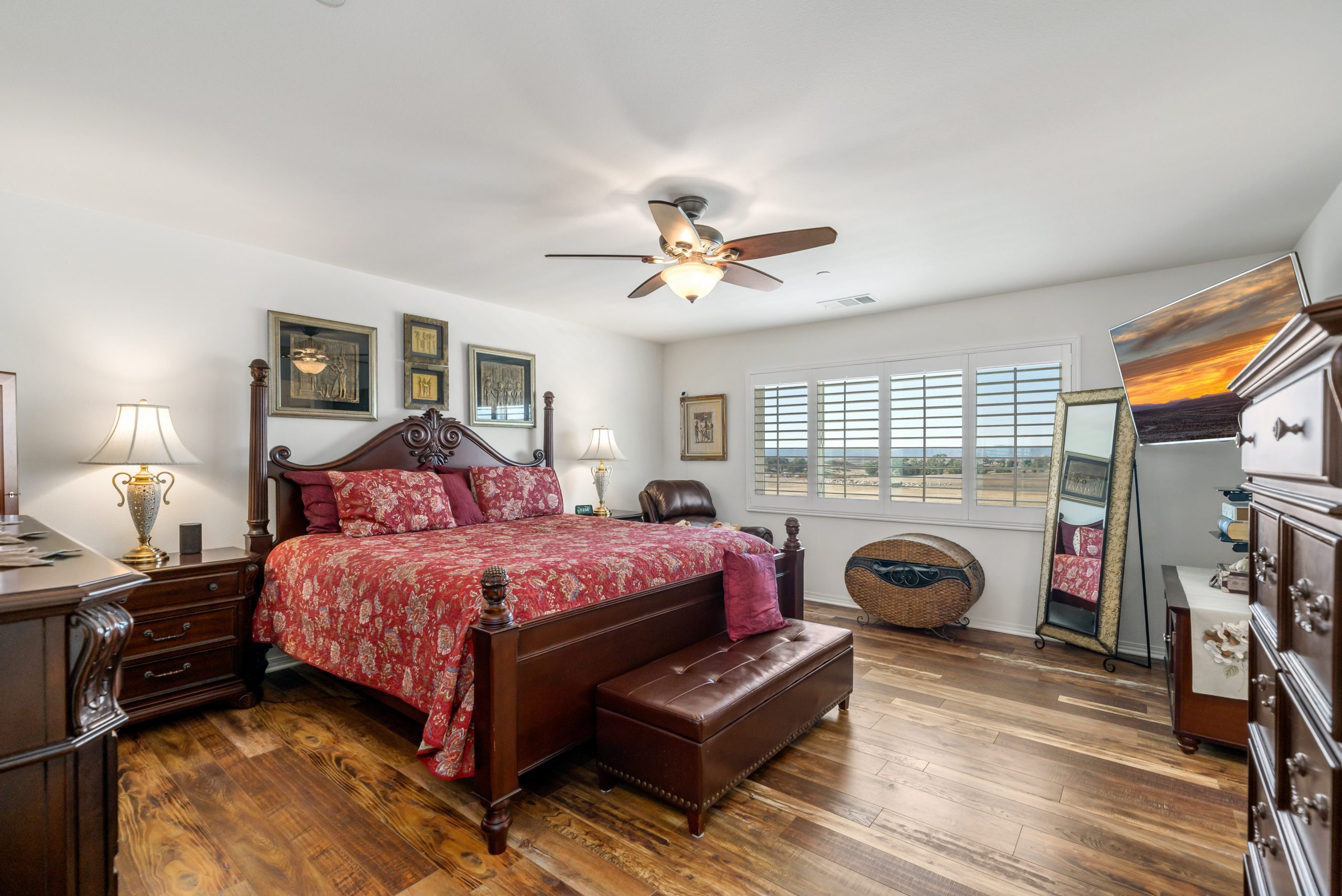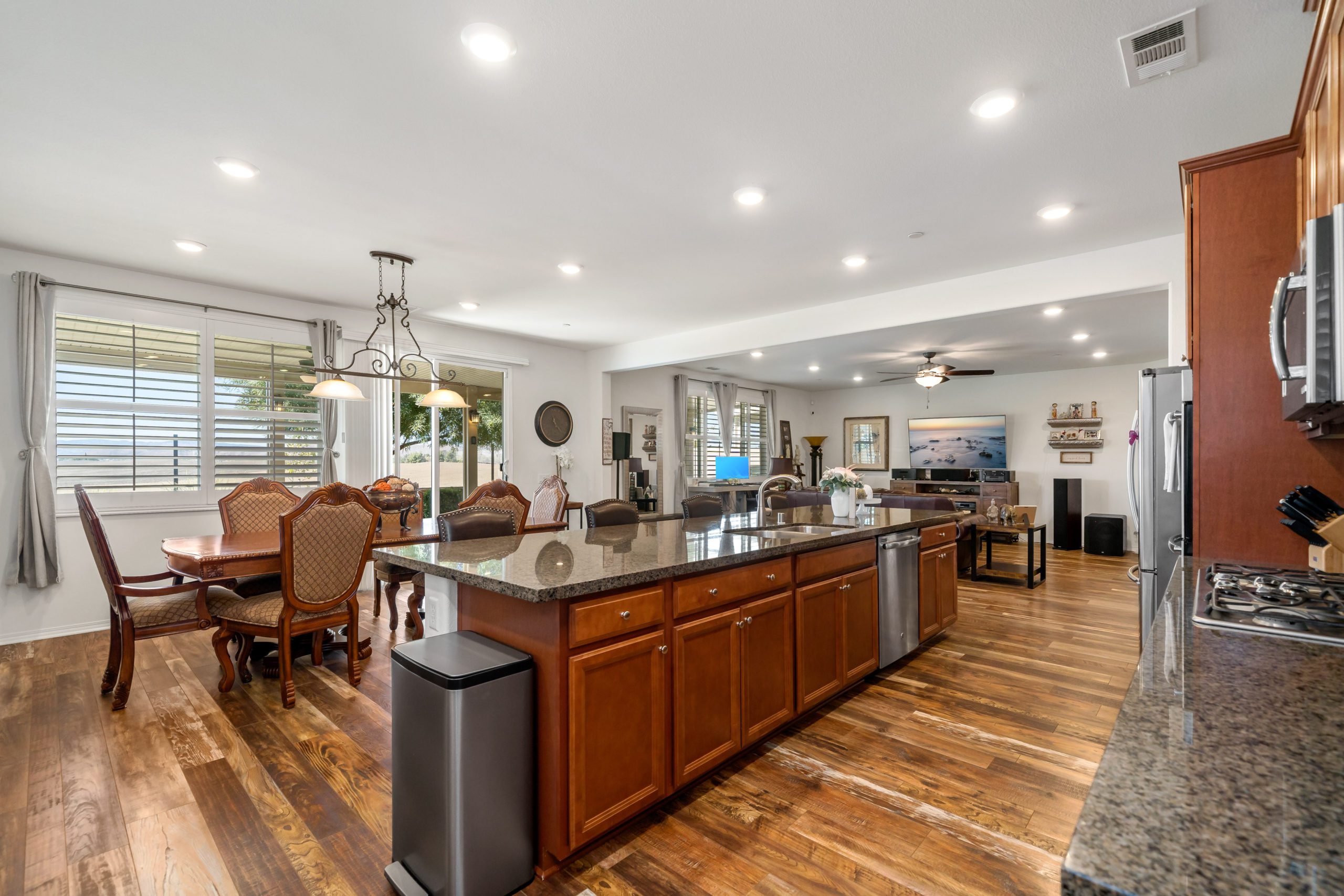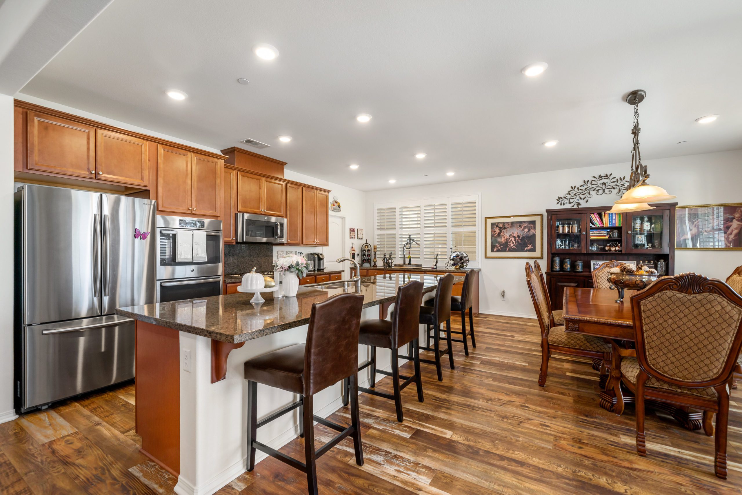 Welcome to the popular master planned community of Rancho Bella Vista. This home is truly over the top from the tremendous upgrades to the spectacular VIEWS from the backyard. From the moment of entry the unique, richly exotic Global Reclaim Worldly Hue flooring throughout will impress even the pickiest of buyers! The open concept kitchen that nicely flows through to the great room is an entertainer’s delight with gorgeous granite counters, side buffet, oversized center island, large walk-in pantry, double ovens and 5-burner stove. The great room features a beautiful corner fireplace. The downstairs is complete with a bedroom and bathroom. The upstairs is a masterfully designed gem fully equipped with loft, laundry room, oversized storage and 3 more bedrooms in addition to the master suite. The master suite includes a roomy walk-in closet, separate tub, shower and dual vanity sinks. Ceiling fans throughout. The very low maintenance backyard comes with Alumawood patio cover, 3 fans, built-in lighting and lovely view glass-ideal for enjoying our spectacular evening sunsets! 15 solar panels. Low taxes and low HOA. Close proximity to Honey Pine Community Park and award winning Temecula schools. Close and convenient to shopping, dining, local wineries and interstates. This is a must see. Call to schedule tour.